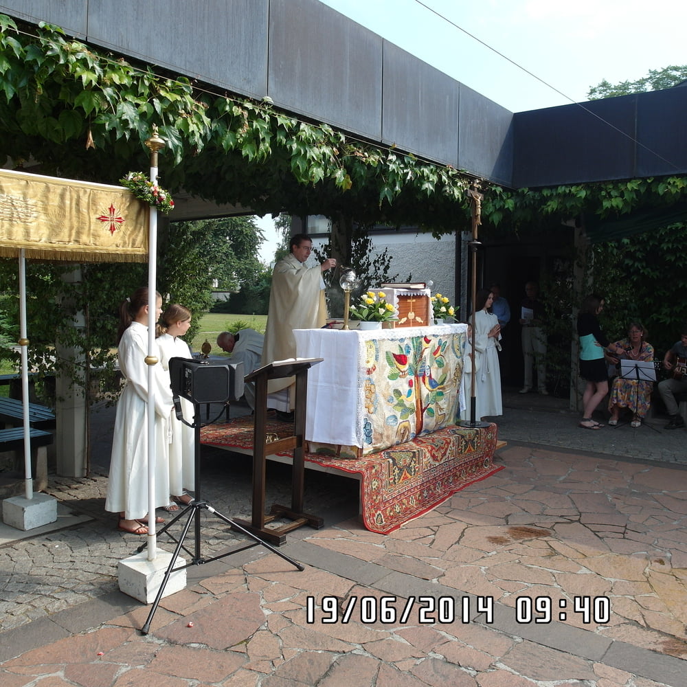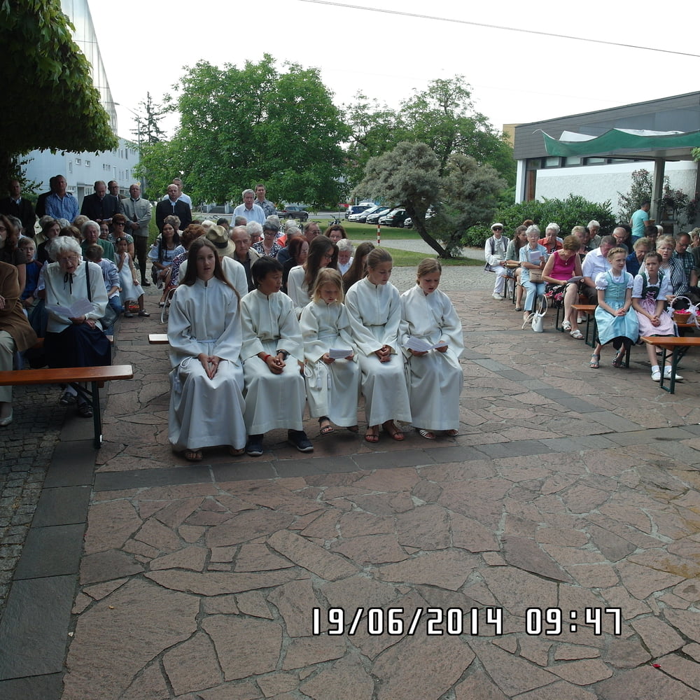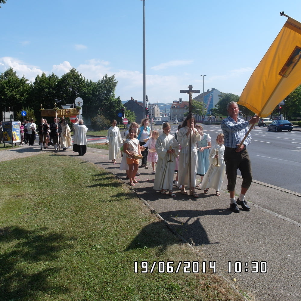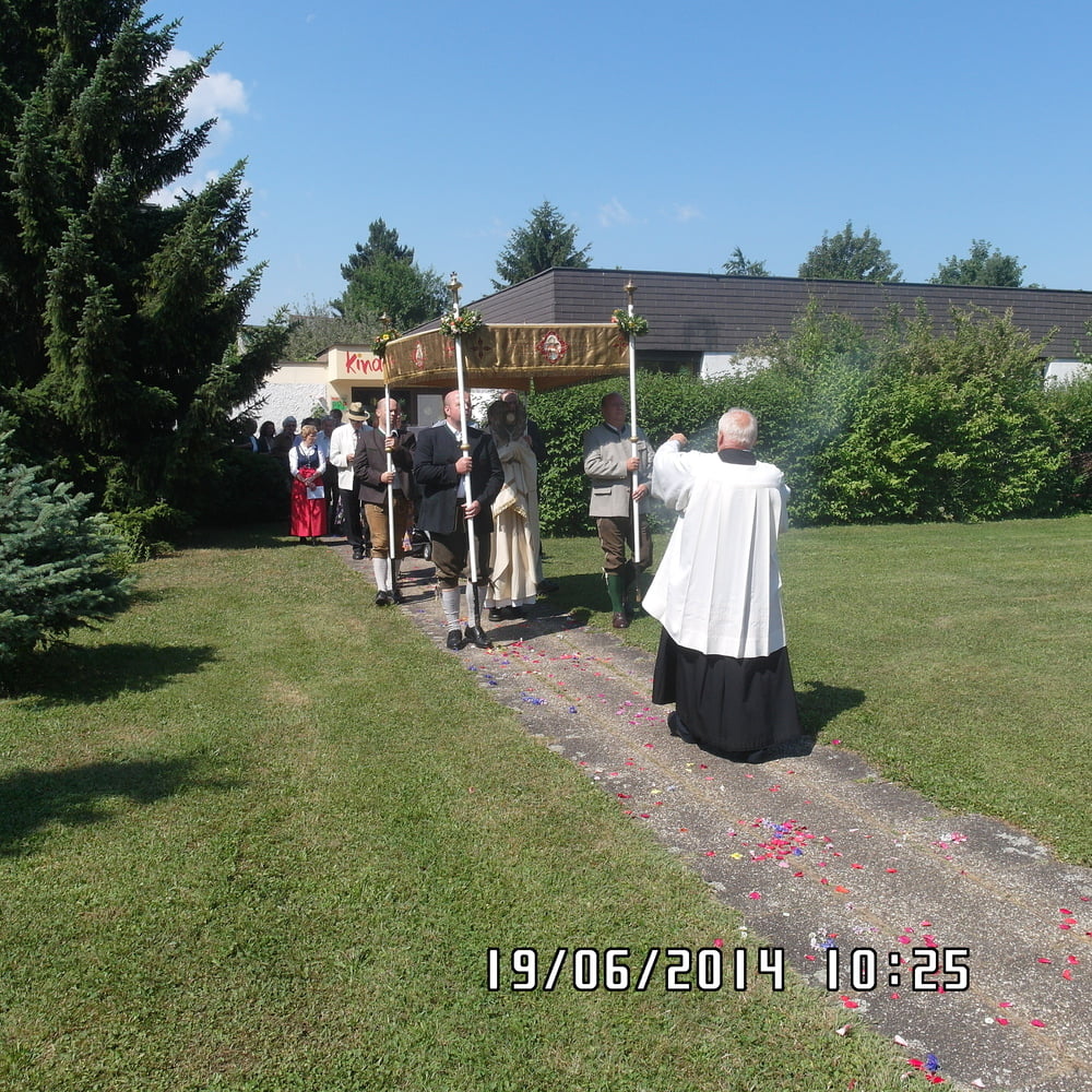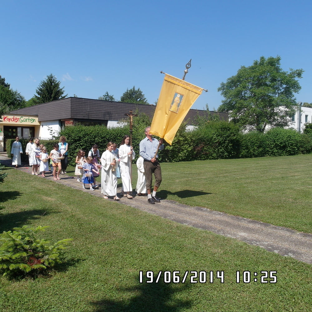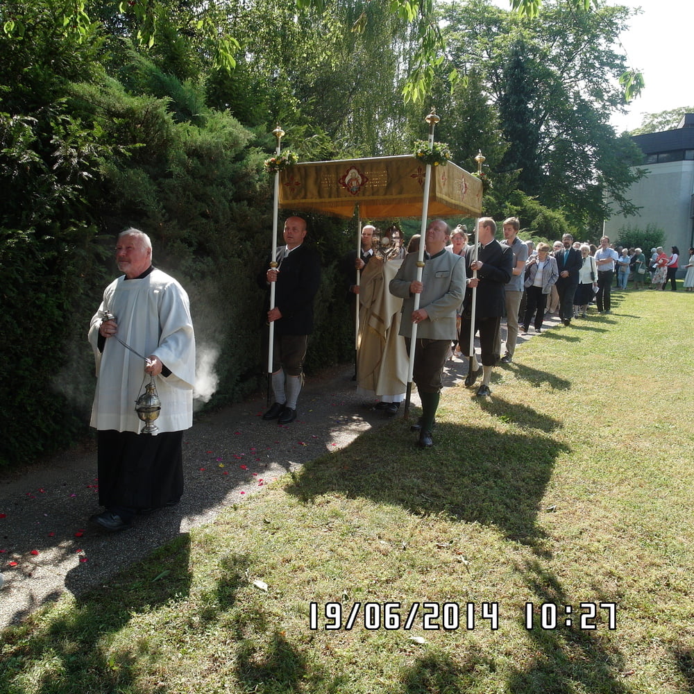 Der liebe Gott hat es mit uns gut gemeint und so konnten wir bei schönem Wetter am Pfarrplatz Fronleichnam feiern. Edith Pichler und Johann Haunschmied begleiteten die Messlieder von Fronleichnam mit der Gitarre. Die Prozession führte uns um die Kirche herum. In der Kirche erhielten wir zum Schluss den Segen.