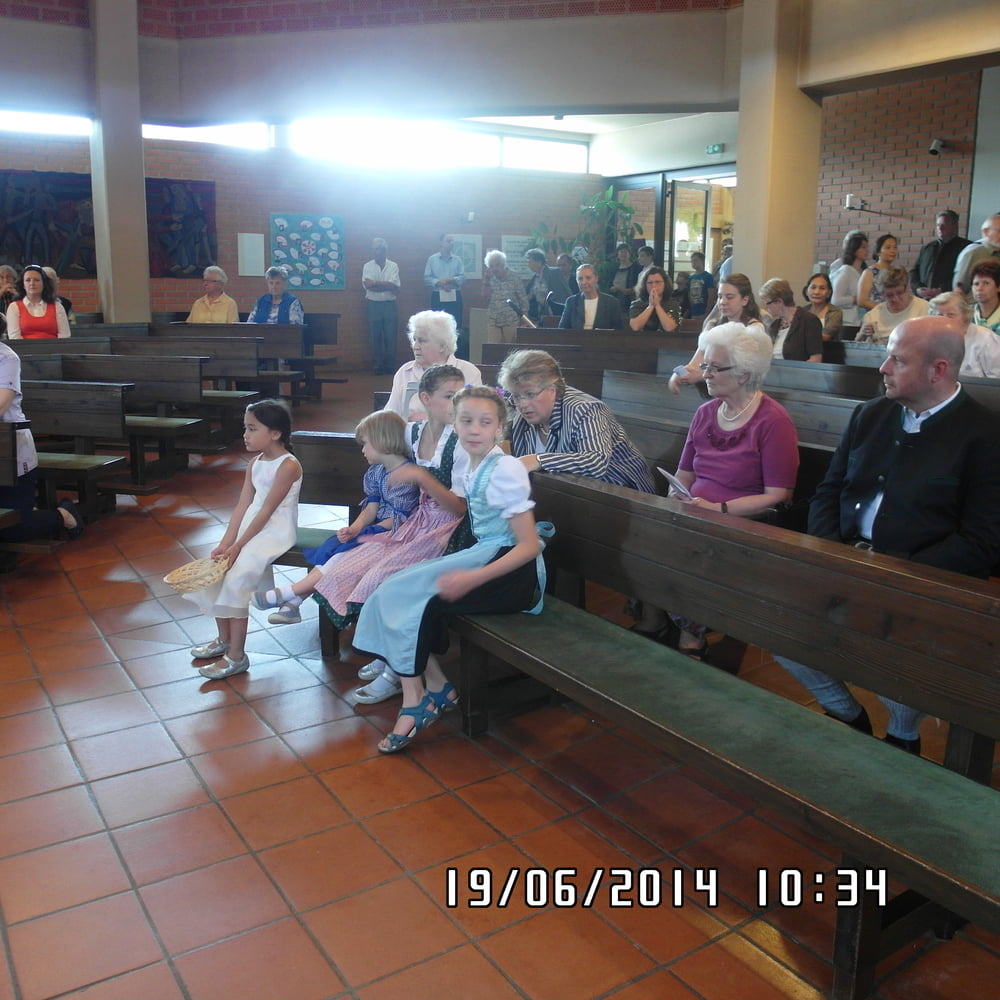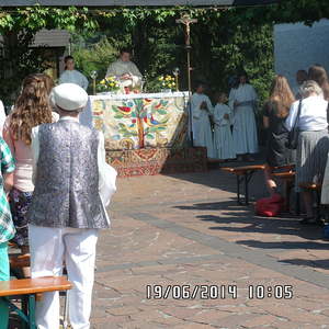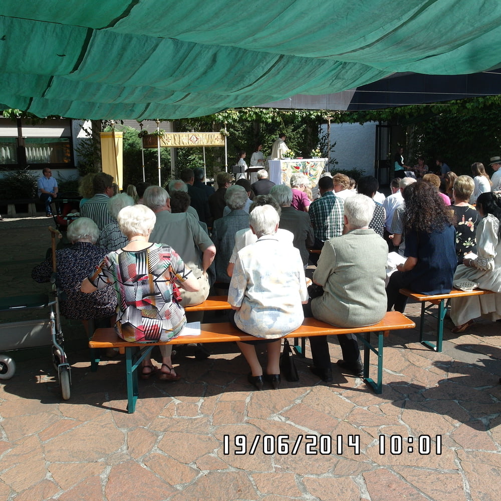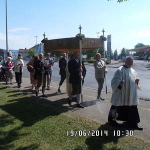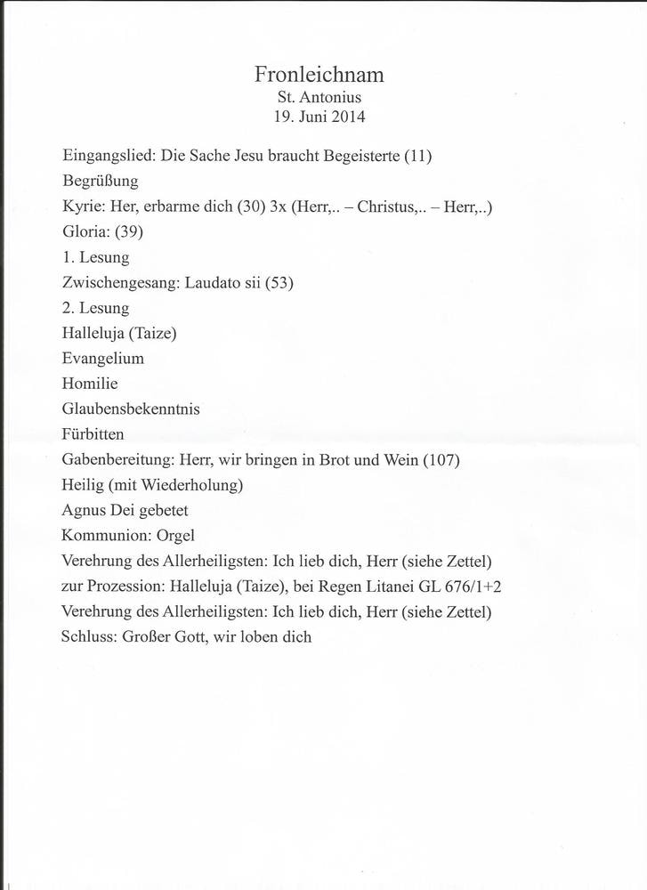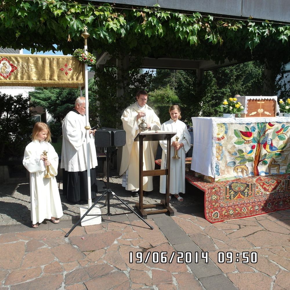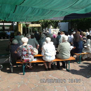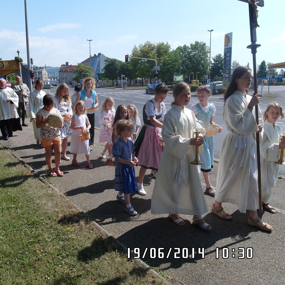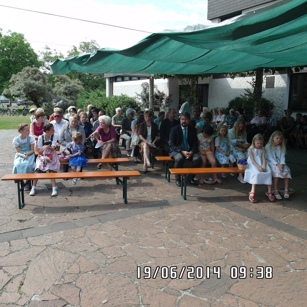 Der liebe Gott hat es mit uns gut gemeint und so konnten wir bei schönem Wetter am Pfarrplatz Fronleichnam feiern. Edith Pichler und Johann Haunschmied begleiteten die Messlieder von Fronleichnam mit der Gitarre. Die Prozession führte uns um die Kirche herum. In der Kirche erhielten wir zum Schluss den Segen.