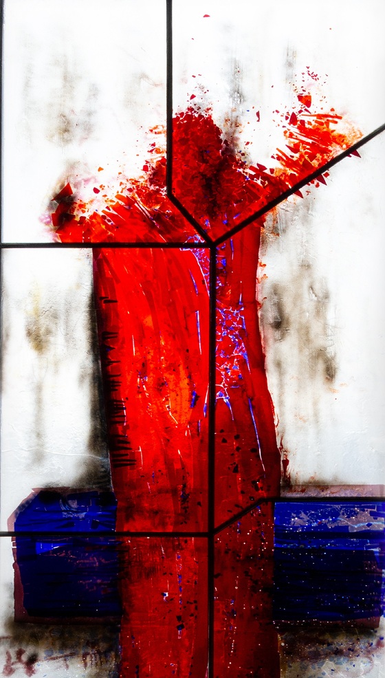 Darauf zu sehen sei eine angedeutete Figur, die nach oben strebt. „Der Mensch kommt aus tiefen Schichten, aus dem Urmeer, aus dem Blau. Rot bedeutet für mich das Leben.“