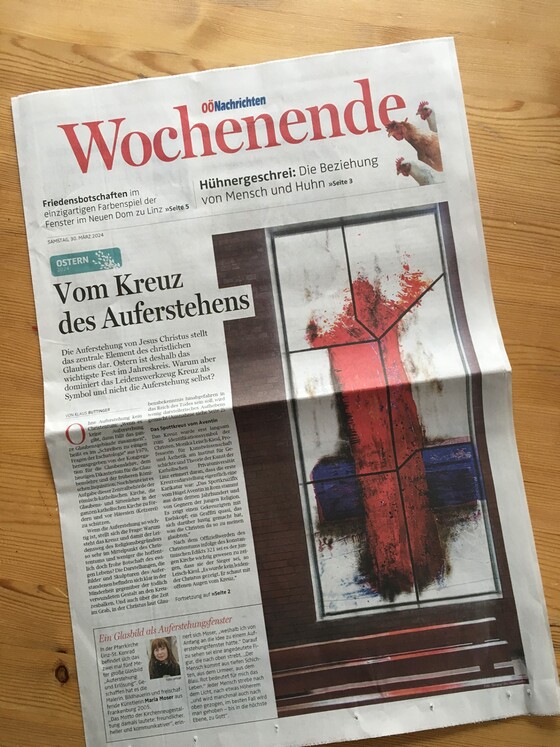 Eindrucksvoll ist in diesem Zusammenhang ein Werk der freischaffenden Künstlerin Maria Moser. Die Malerin und Bildhauerin aus Frankenburg hat in der Pfarrkirche Linz-St. Konrad ein Glasfenster mit dem Titel „Auferstehung und Erlösung“ geschaffen.