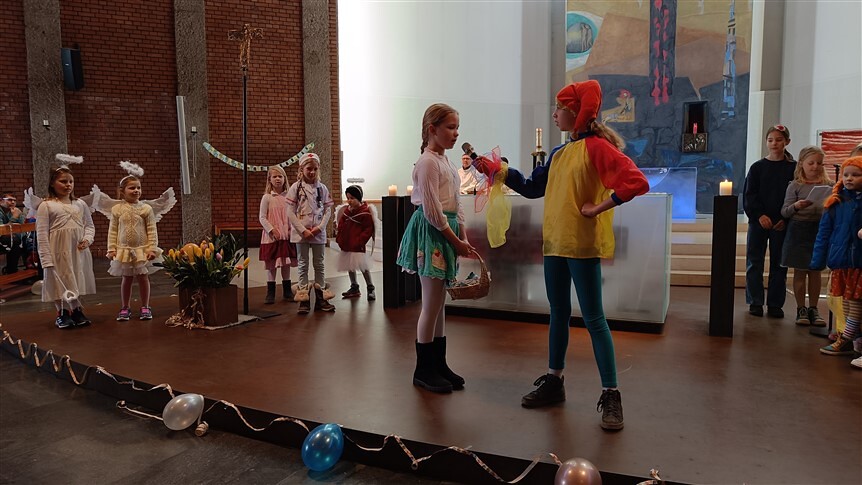 Ein besonderes Highlight war die Aufführung eines Theaterstücks der Froschgoscherl. Sie präsentierten uns die Geschichte der „Gauklerin“. Die Gauklerin war auf der Suche nach dem Sinn ihres Daseins. Sie war traurig und verzweifelt, da ihr als Gauklerin niemand eine „sinnvolle“ Arbeit zutraute. Schließlich wurde sie von drei Engeln getröstet und ermutigt. Sie erkannte die Wichtigkeit ihrer Existenz als Gauklerin, da „Lachen den Menschen Freude bringt“. Zur Freude aller gab es zum Schluss eine einzigartige Polonaise durch die Kirche, die von Pauken und Trompeten begleitet wurde.