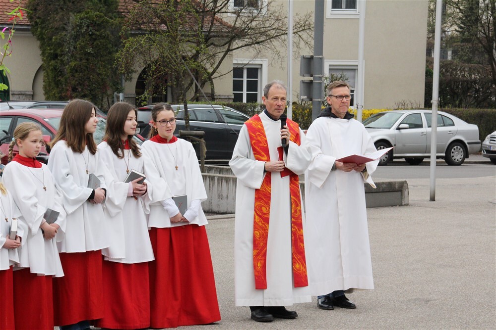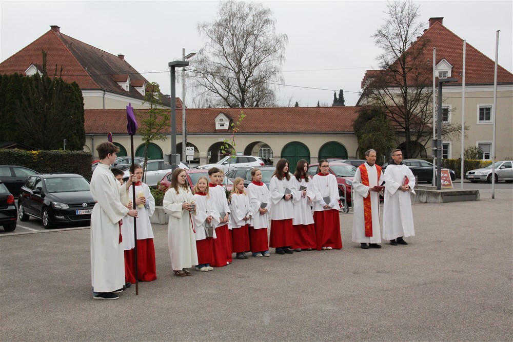 Beim Gottesdienst in der Pfarrkirche stand auch heuer in traditioneller Weise die Passionsgeschichte, vorgetragen von Dr. Martin Füreder, Klara Loishandl und Agnes Lederbauer im Mittelpunkt. Dieser zentrale Bericht über das Leiden und Sterben Jesu bringt über die Jahrtausende hinweg unverändert zum Ausdruck, dass Jesus bedingungslos Leiden und Tod auf sich nimmt, um den Menschen nahe zu sein und Gottes Liebe zu offenbaren.