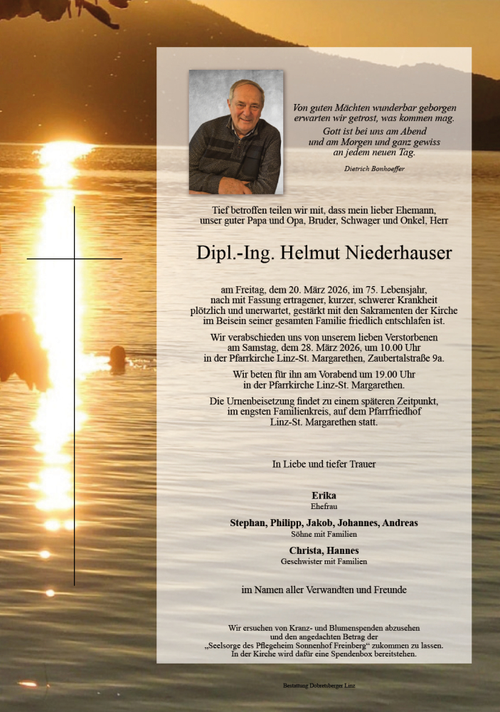 Wir beten für Helmut Niederhauser am Freitag, dem 27. März, um 19.00 Uhr in der Pfarrkirche Linz-St. Margarethen.