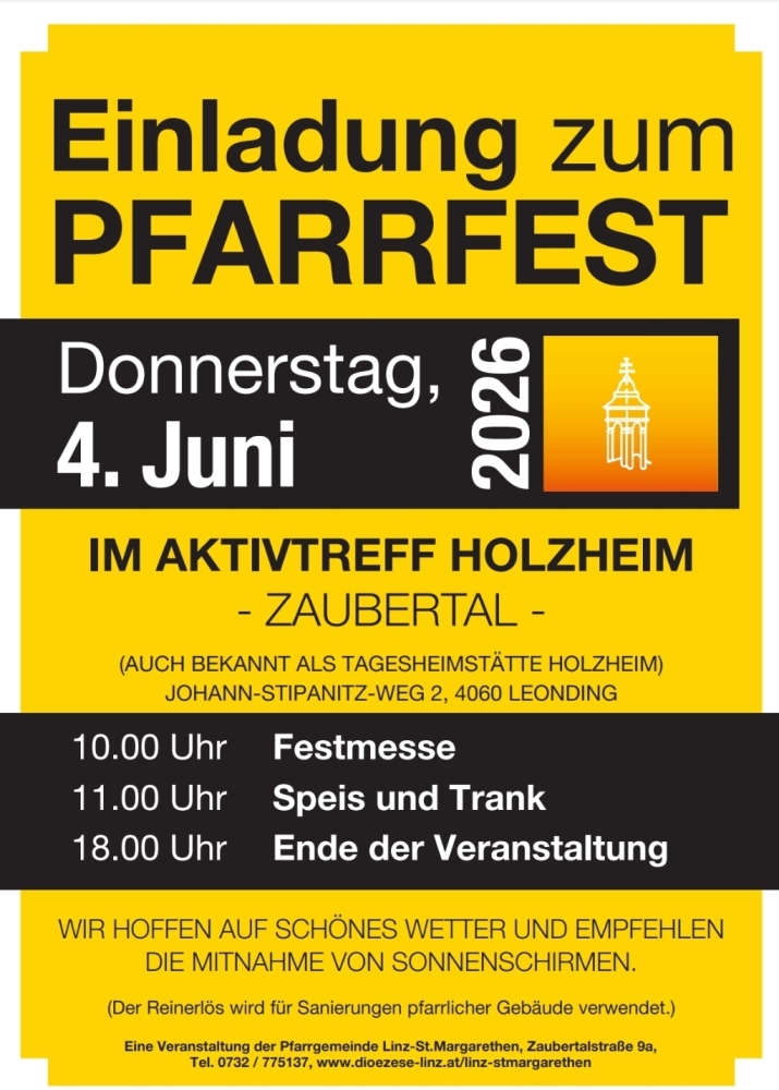 Es ist wieder soweit – die Vorbereitungen laufen schon. Kommt mit euren Familien und (neuen u. alten) Nachbarn zum alljährlichen Pfarrfest! Es gibt warmes Mittagessen und Salate, Kaffee und Kuchen, Zaubertaler Bier und Spezialweine, ein Kinderprogramm und viel zum Reden.