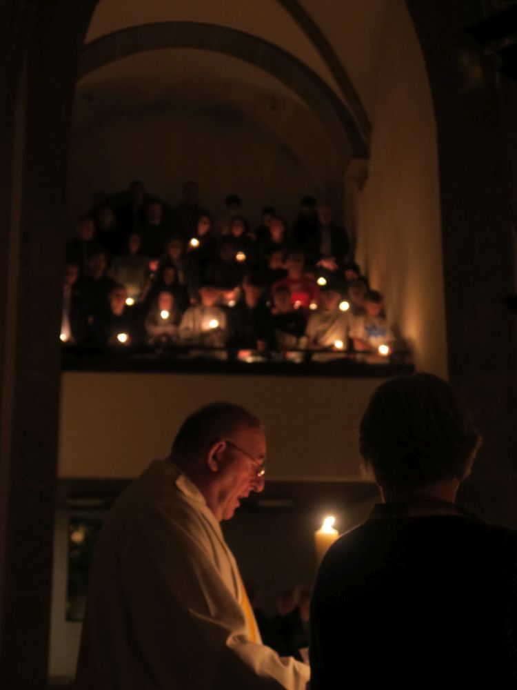 Gründonnerstag. 28. 3.: Erstmals musste diese Feier ohne Priester stattfinden. Sie begann mit einer Agape im Pfarrsaal, bei dem die Anwesenden ein Stück Brot und ein Glas Wasser bzw. Wein zum Andenken an das Abendmahl, das Jesus mit seinen Jüngern gefeiert hat, erhielten. Anschließend fand eine Prozession in die Kirche statt, wo die AbschiedsredeJesu in ihrer gesamten Länge vorgetragen wurde, unterbrochen von meditativen Gesängen des Familienchors.