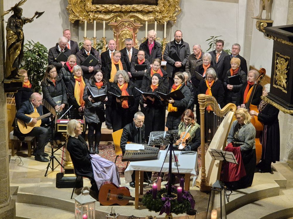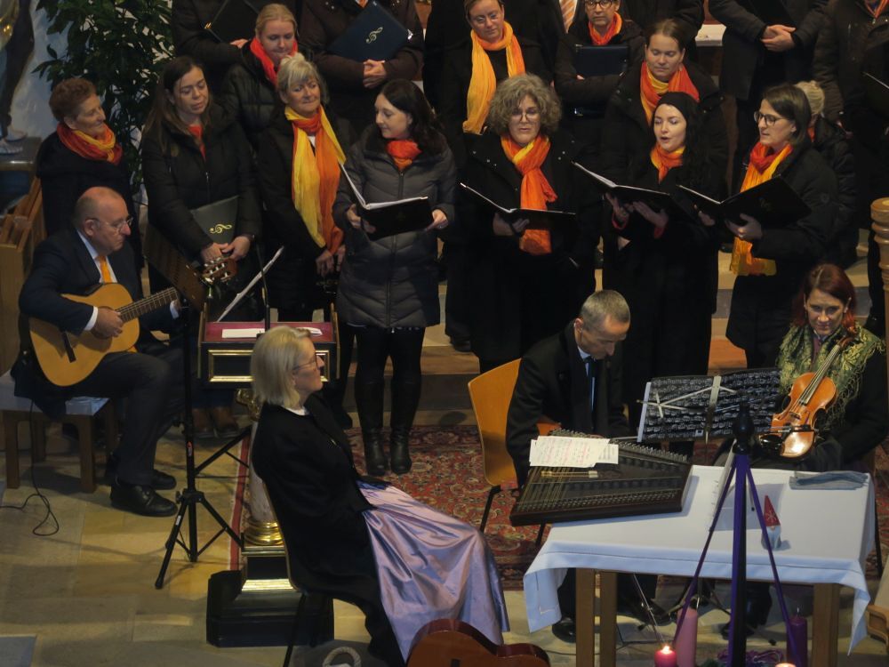 „S´ Liacht is da“ war das Thema des diesjährigen Adventkonzerts des Familienchores St. Magdalena. Mit meditativen Texten legte Georg König eine „Licht-Spur“ durch diese besinnliche Abendstunde. In der völlig abgedunkelten Kirche begann er mit Gedanken zur Dunkelheit: „Im Dunkel naht die Weihnachtszeit“ war auch das Leitmotiv des ersten musikalischen Teils. Wie es in der Kirche immer heller wurde – zuerst nur durch Kerzen – waren auch die Lieder des Chors immer stärker geprägt vom Thema Licht: „Advent is a Leuchtn“ und „S´ Liacht is da“. Nicht nur die Lieder des Chors, auch die vier Damen und der Herr der „Bachlbergmusi“ trugen zur besinnlichen Atmosphäre des Abends bei.
