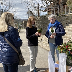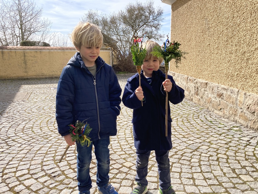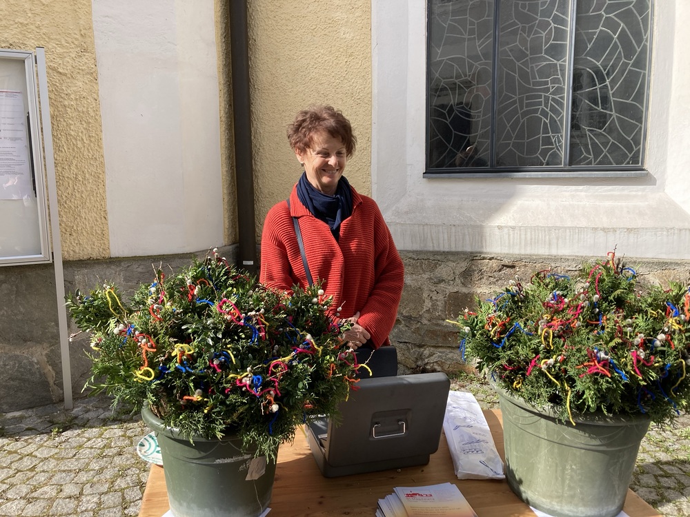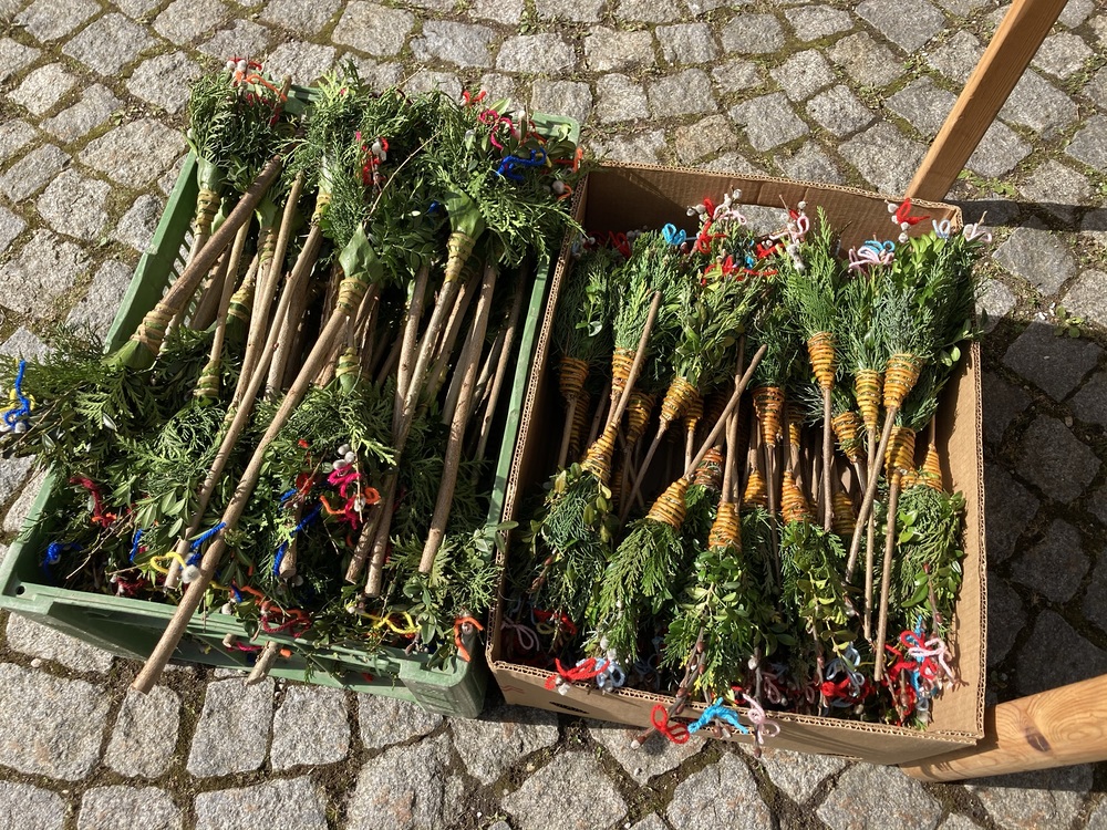 Großen Anklang fanden die Palmbuschen am Palmsonntag 2021: nicht nur vor und nach den Gottesdiensten, sondern auch nachmittags auf der Pferdebahnpromenade. Restbestände sind in der Kirche noch erhältlich.