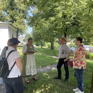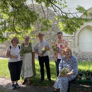 Der Weg führte von den Linden bei der Martinskirche über den Schlossberg und das Schloss wieder zur Martinskirche. Die Teilnehmer:innen konnten am Weg ihre Kräuter für eigene Sonnenwendbuschen sammeln. Im Pfarrheim wurden dann Sonnwendbuschen gebunden und es gab als Abschluss noch Hollerkracherl und Hollerkrapfen.