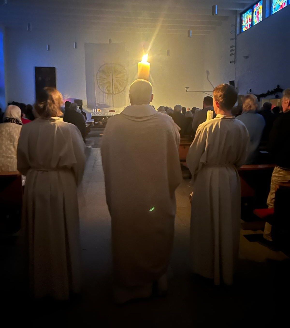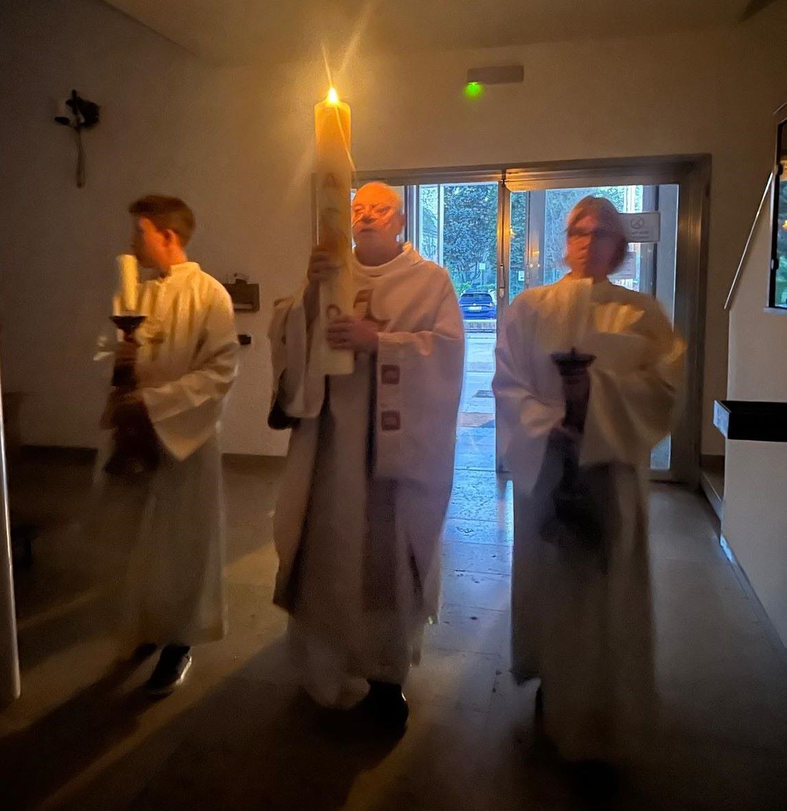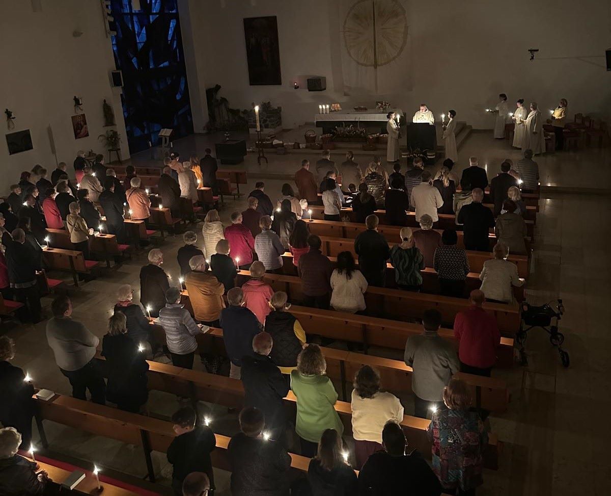 Ausgehend von der Osterkerze empfingen alle Feiernden mit ihren Kerzen das Licht. Als der Priester feierlich das "Exsultet" sang, dankten wir für diese Nacht der Befreiung, für die Auferstehung Christi von den Toten, für den Beginn unseres Heils. Nach dem Osterevangelium konnten wir unter Orgel- und Glockenklang freudig singen: „Der Heiland ist erstanden, halleluja.“