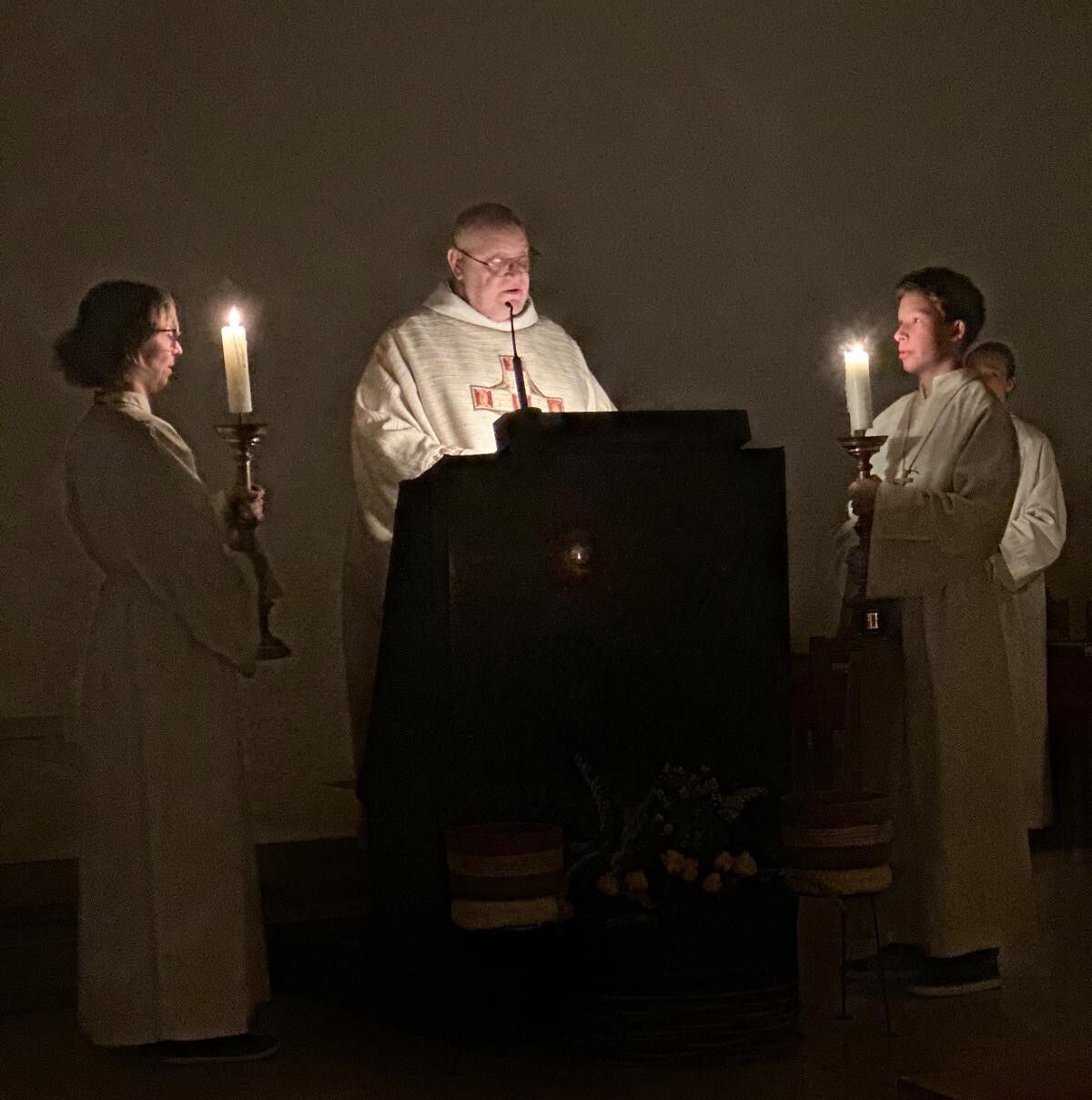 Im Osterfeuer am Kirchenplatz entzündete Pfarrer Zeiger die Osterkerze und trug sie dann mit dem Ruf "Lumen Christi“ in die Kirche. Dort erwarteten wir in der Dunkelheit schon sehnsüchtig das Licht.
