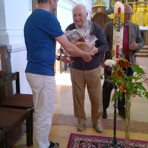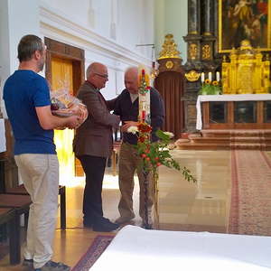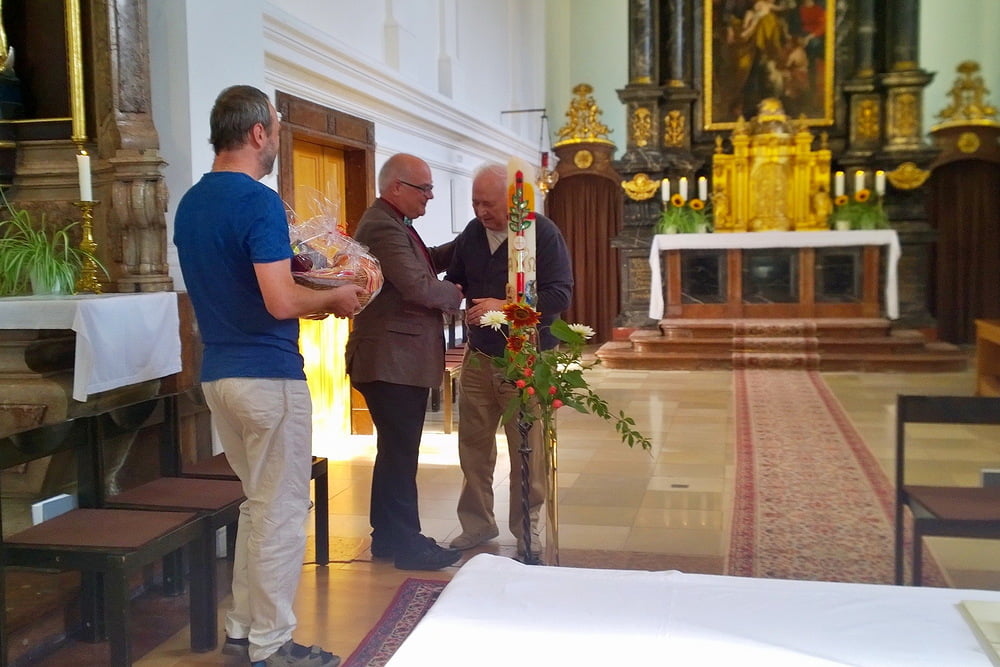 Im Anschluss an den Gottesdienst bedankt sich Armin Bumberger (in Vertretung von PGR-Obmann Ralf Sonnberger) bei seinem Kollegen Prof. Arnold Blöchl für seine langjährigen ehrenamtlichen Orgeldienste in der Stadtpfarre Urfahr.