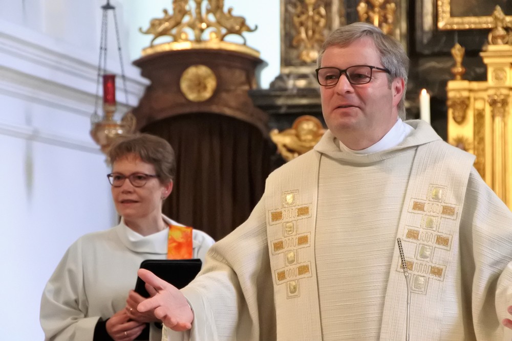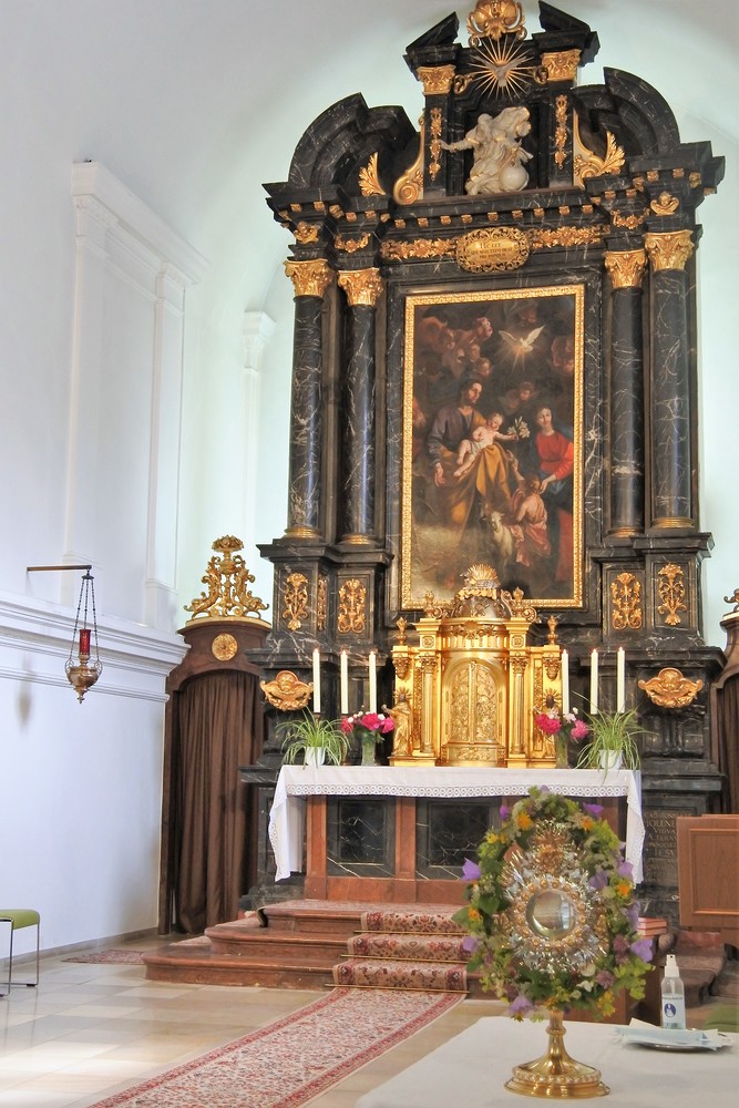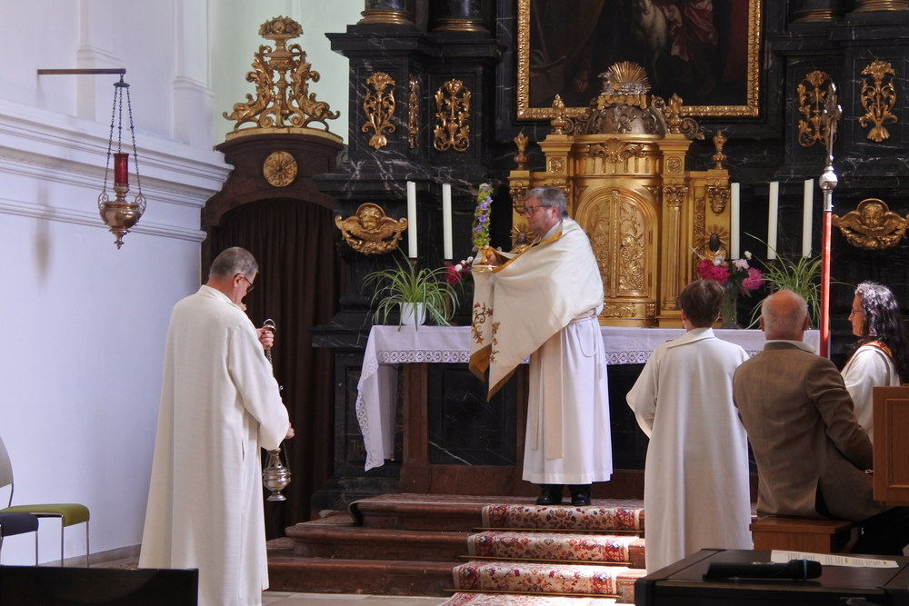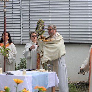 Feierliche Messe in Kirche und Prozession im kleinen Kreis zu einer Feier im Hillingerheim.