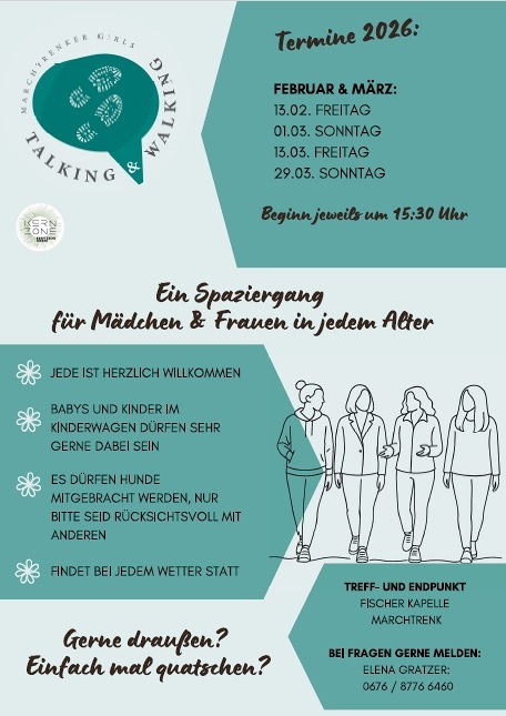 Für alle Neuinteressentinnen: Gehen Sie gern spazieren und möchten dabei neue Kontakte knüpfen? Egal ob alleine oder mit der Freundin, Tochter, Mutter, Oma oder Nachbarin, mit Baby im Kinderwagen oder Kleinkind am Laufrad, im Rollstuhl, mit dem Hund, jahr(zehnt)elang in Marchtrenk wohnend oder vor kurzem zugezogen, alle Mädchen und Frauen sind herzlich eingeladen an folgenden Terminen gemeinsam spazieren zu gehen: