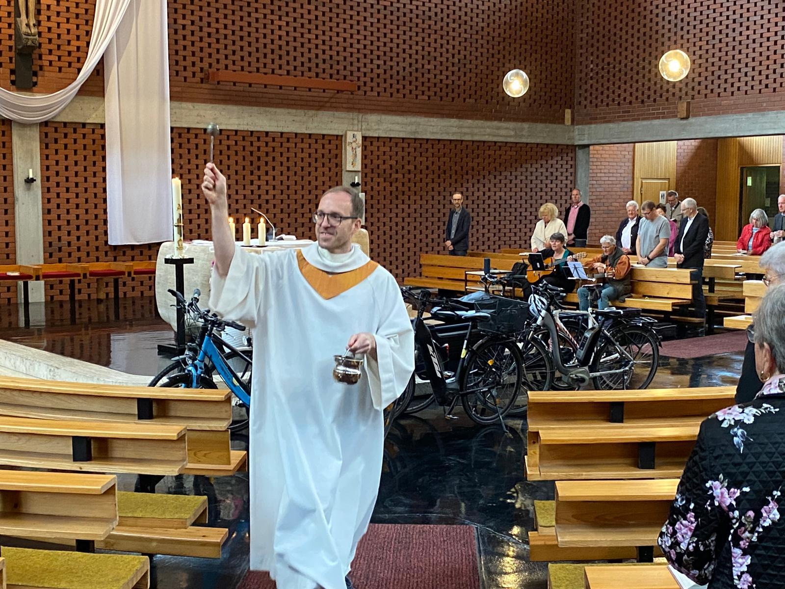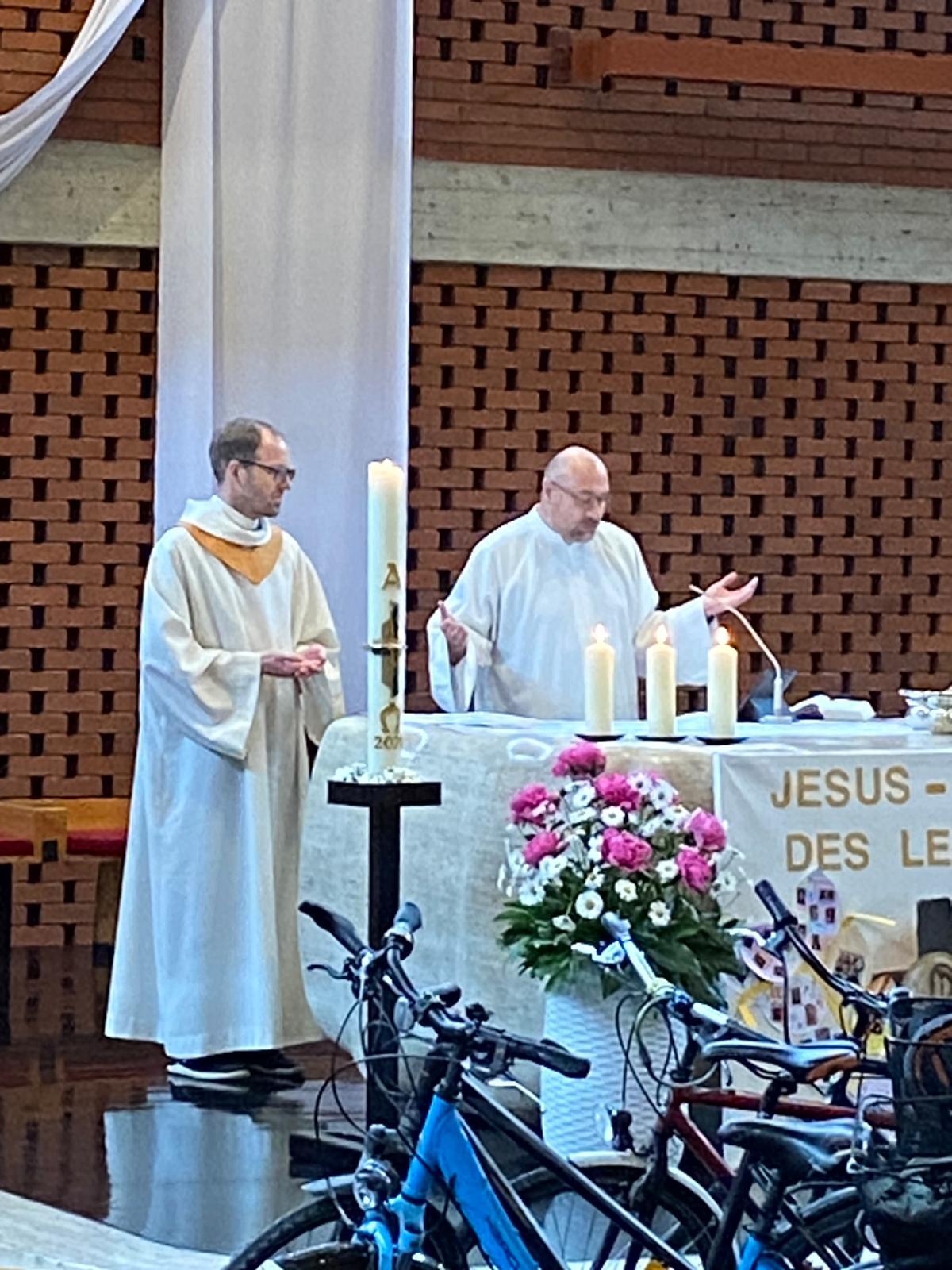 Sowohl die mitgebrachten Fahrräder wie auch die neuen Fahrradständer wurden gesegnet. Wir bedanken uns bei den beiden Unternehmen GesundesTeam.at und Barrierefrei PDF OG für das Sponsoring der Fahrradständer!