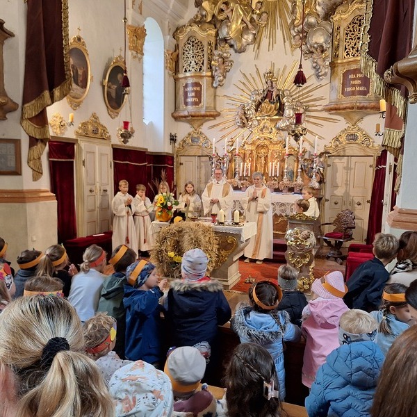 WIe groß war die Freude über die vielen Kinder und Familien, die wir beim Kindergarten begrüßen durften! Mit der gesegneten Erntekrone und begleitet von der Musikkapelle Hochburg-Ach zog die Feiergemeinde in die Pfarrkirche ein.