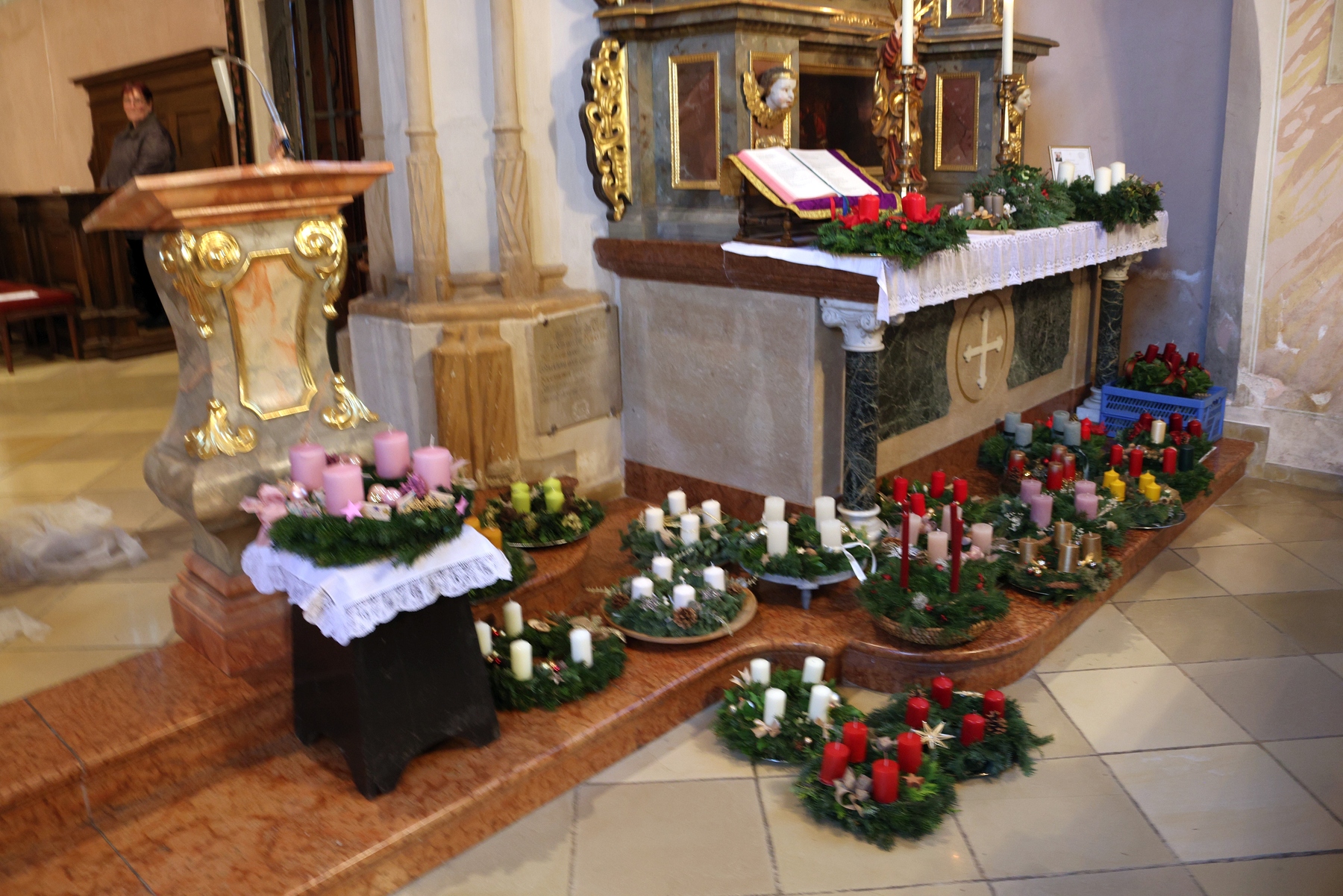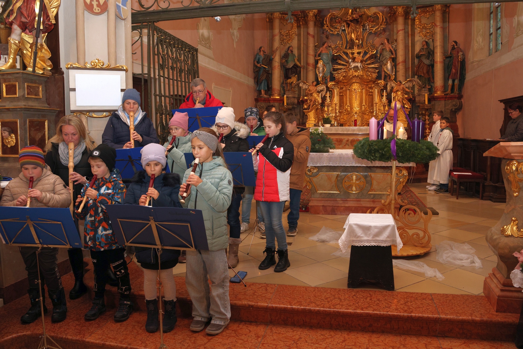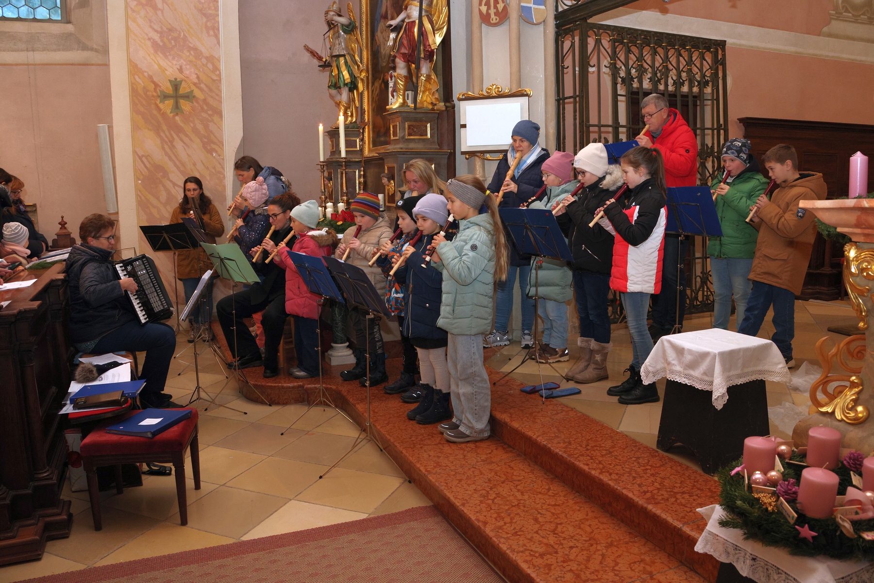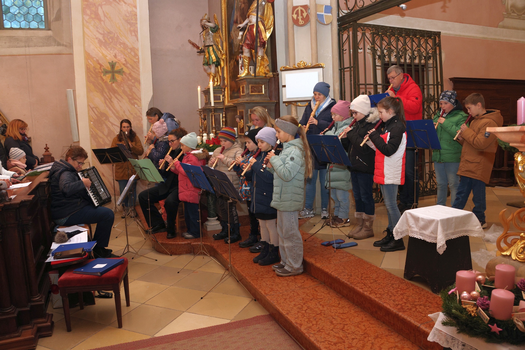 Die Adventkranzweihe der KFB war wieder sehr gut besucht. Pater Werner leitete die Andacht und Maria Gschwendtner mit ihrer Flötengruppe begeisterte die Besucher.