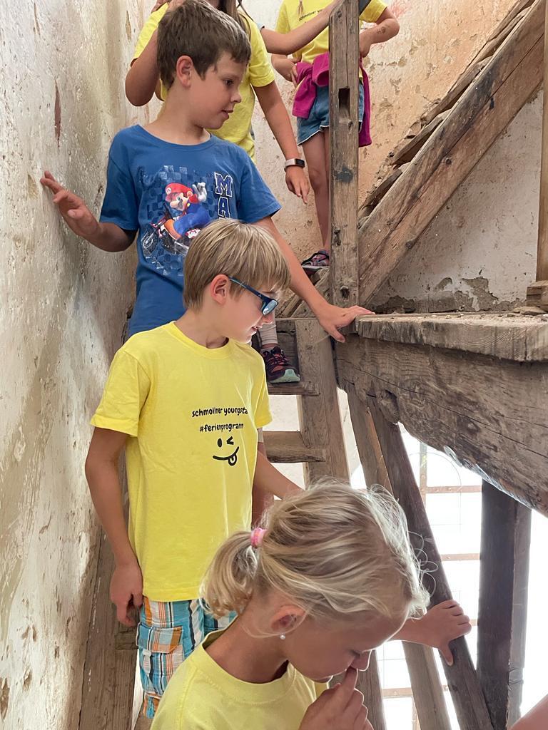 Nach gut der Hälfte der Zeit, galt es endlich die spannendsten Treppen zu erklimmen, die Treppen zum Chorraum und die davon abgehende Treppe zum Glockenturm hinauf. Dazu wurden die Kinder aus Sicherheitsgründen in mehrere Kleingruppen geteilt, so konnte jede Gruppe nach und nach die letzten drei Geheimnisse erkunden: Zum einen zeigte und erklärte uns unsere Chorleiterin und Organistin Eva Korntner die Orgel, die im Anschluss auch von den Kindern ausprobiert werden durfte. Währenddessen entdeckte eine andere Gruppe die geheime Tür zu den Fledermäusen, die zu diesem Zeitpunkt mit ihren Jungtieren gerade in den Wochenstuben im Dachboden der Kirche hingen und schliefen. Zwar konnten diese, da sie vor allem in der Säugezeit streng unter Naturschutz stehen, nicht direkt besichtigt werden, jedoch hörten wir sie laut fiepen, und natürlich fiel einem auch der Fledermausdreck (Guano) ins Auge und in die Nase.