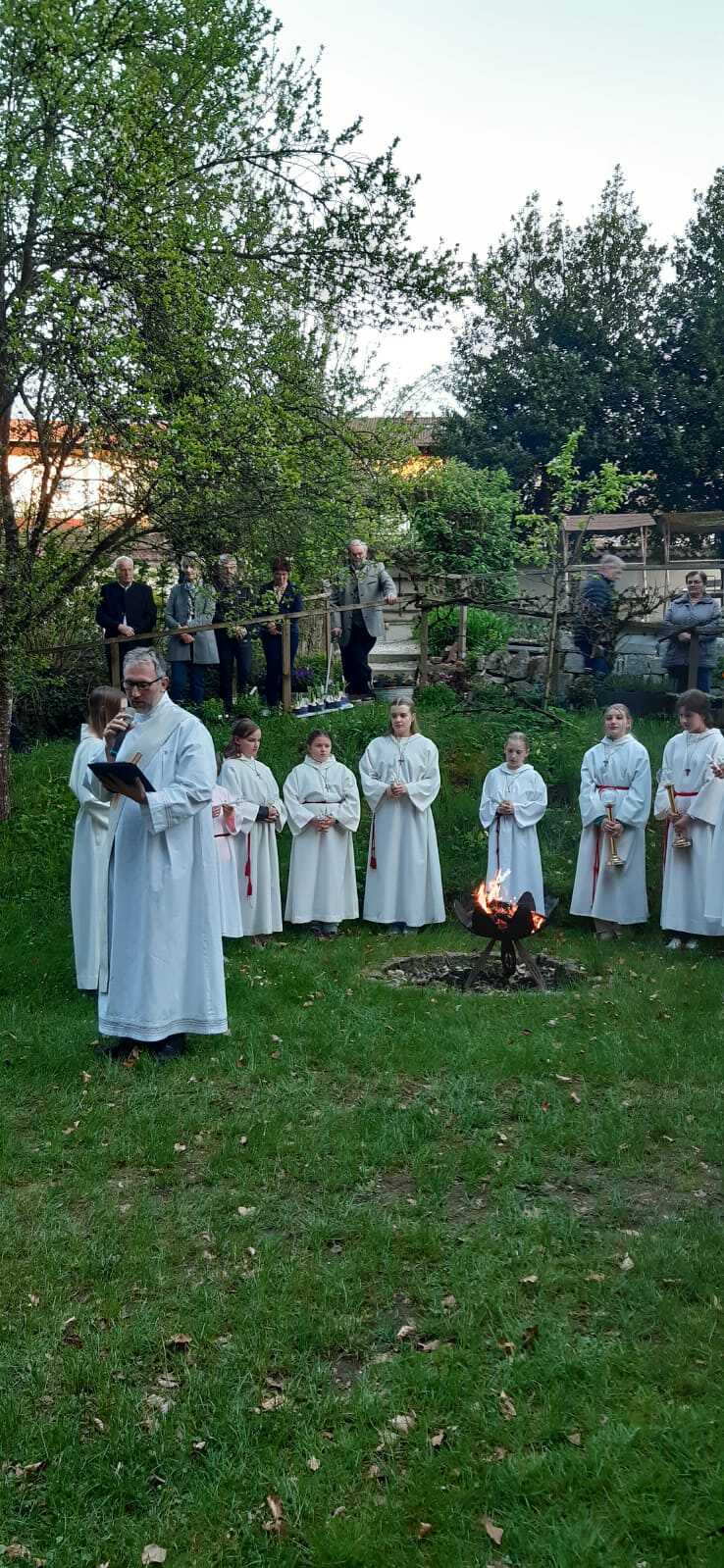 Um 19:45 Uhr wird das Osterfeuer gesegnet und die Osterkerze entzündet.
