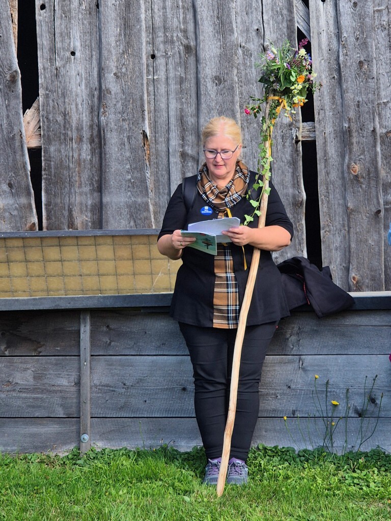 Zeit zu leben war das verbindende Motto, unter dem der Tag stand. Unterwegs luden die Wegbegleiterinnen, die die Gruppen führten, mit spirituellen Impulsen und Liedern zum Innehalten ein. Jede Gruppe trug einen Pilgerstab mit, der mit Kräutern und Blumen geschmückt war und zu Beginn des Tages gesegnet wurde.