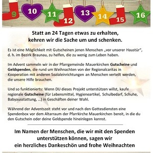 In der Adventszeit steht vor und nach den Gottesdiensten wieder unser umgekehrter Adventkalender bereit – eine Spendenaktion der Caritas für Hilfsprojekte in unserem Bezirk.