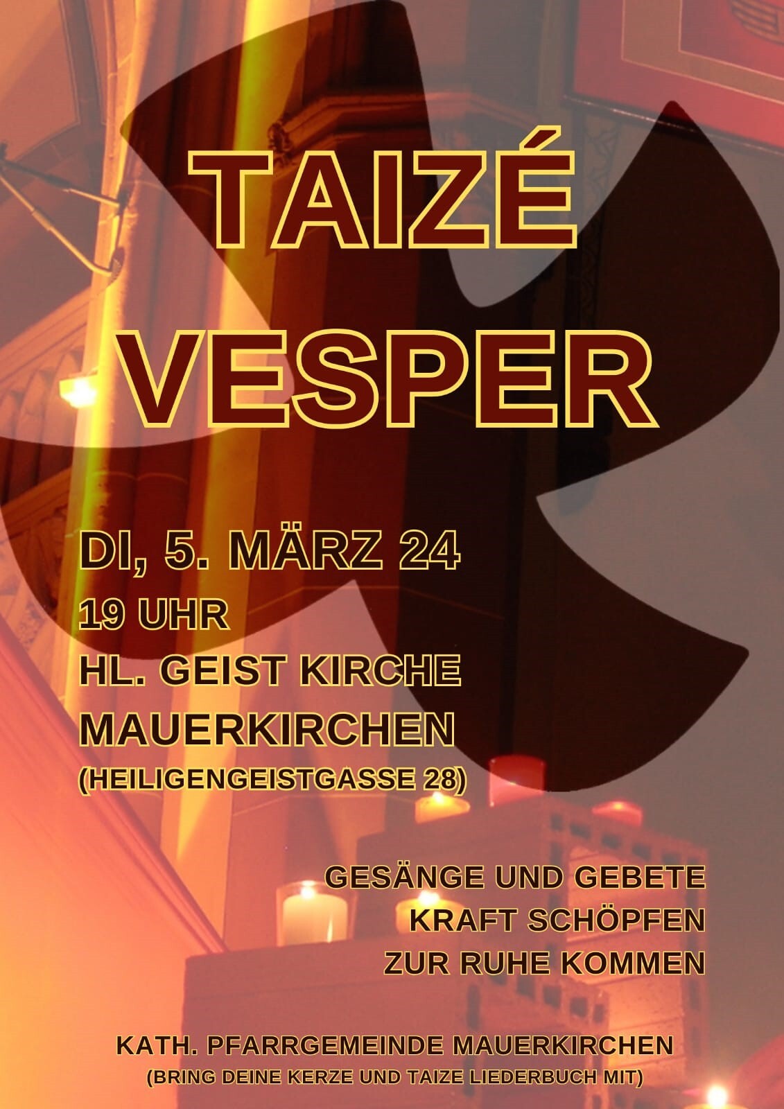 Taize - Vesper in der Hl. Geistkirche in Mauerkirchen am Dienstag , 12. Dezember 2023 um 19 Uhr. Bitte Kerze mit Tropfschutz mitnehmen (Teelicht), auch Liederbuch wenn vorhanden.