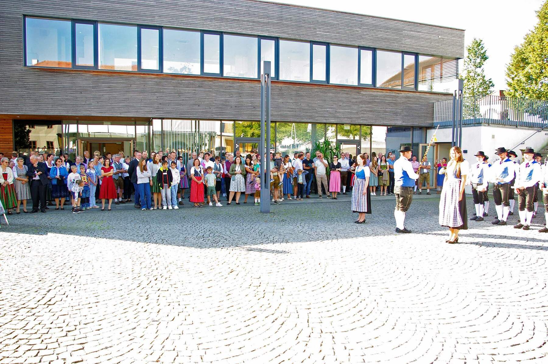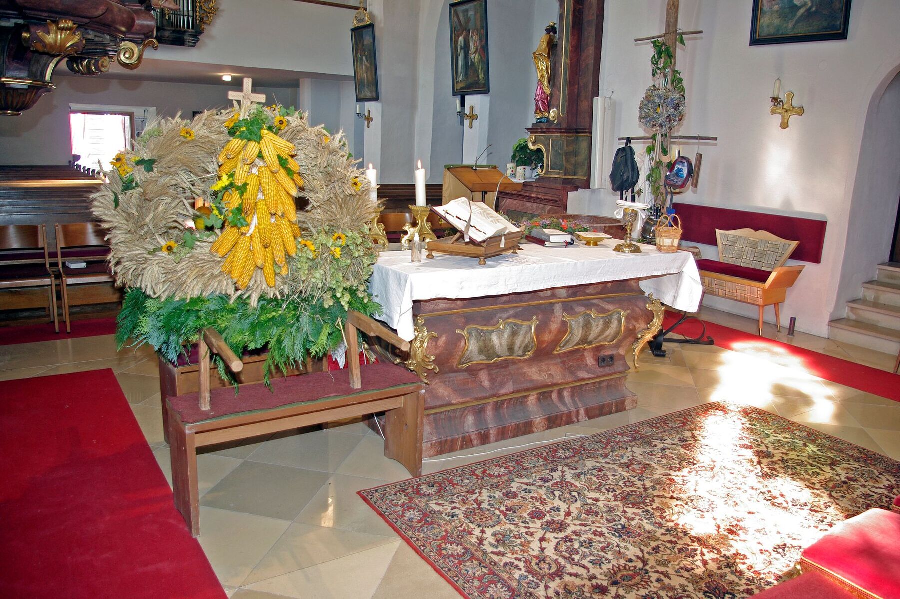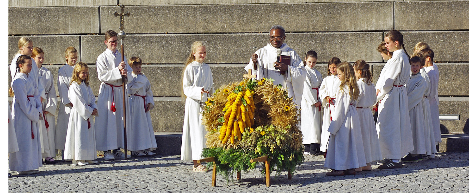 Begleitet vom Gesang der Volksschulkinder und dem Spiel der Musikkapelle wurde die von der Bauernschaft gebundene Erntedankkrone von der Landjugend auf den Dorfplatz getragen, wo unser Pfarradmin. Anthony Echechi diese als Zeichen des Danks segnete.