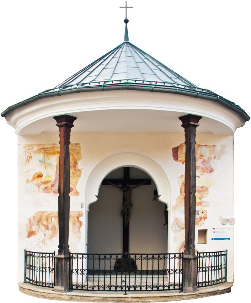 1846 kommen von Kooperator Gatterbauer (später Pfarrer) zu diesem Text noch Details hinzu: „ Die Kapelle ist rund gebaut und gemauert, hat vorn im Halbrundelle das Dach auf ziemlich großen Säulen aus Holz gestützt. Die Kapelle ist inwendig ausgemalen, auf den Seitenwänden das Hl. Abendmahl und die Jünger zu Emaus auf die Mauer gemalen. Die Malerarbeit ist vom hiesigen Maler Bauer. Diese Kapelle wird von der Pfarrgemeinde statt eines Kalvarienberges besucht.“ Die folgenden Inventare übernehmen diese Beschreibung fast wörtlich.