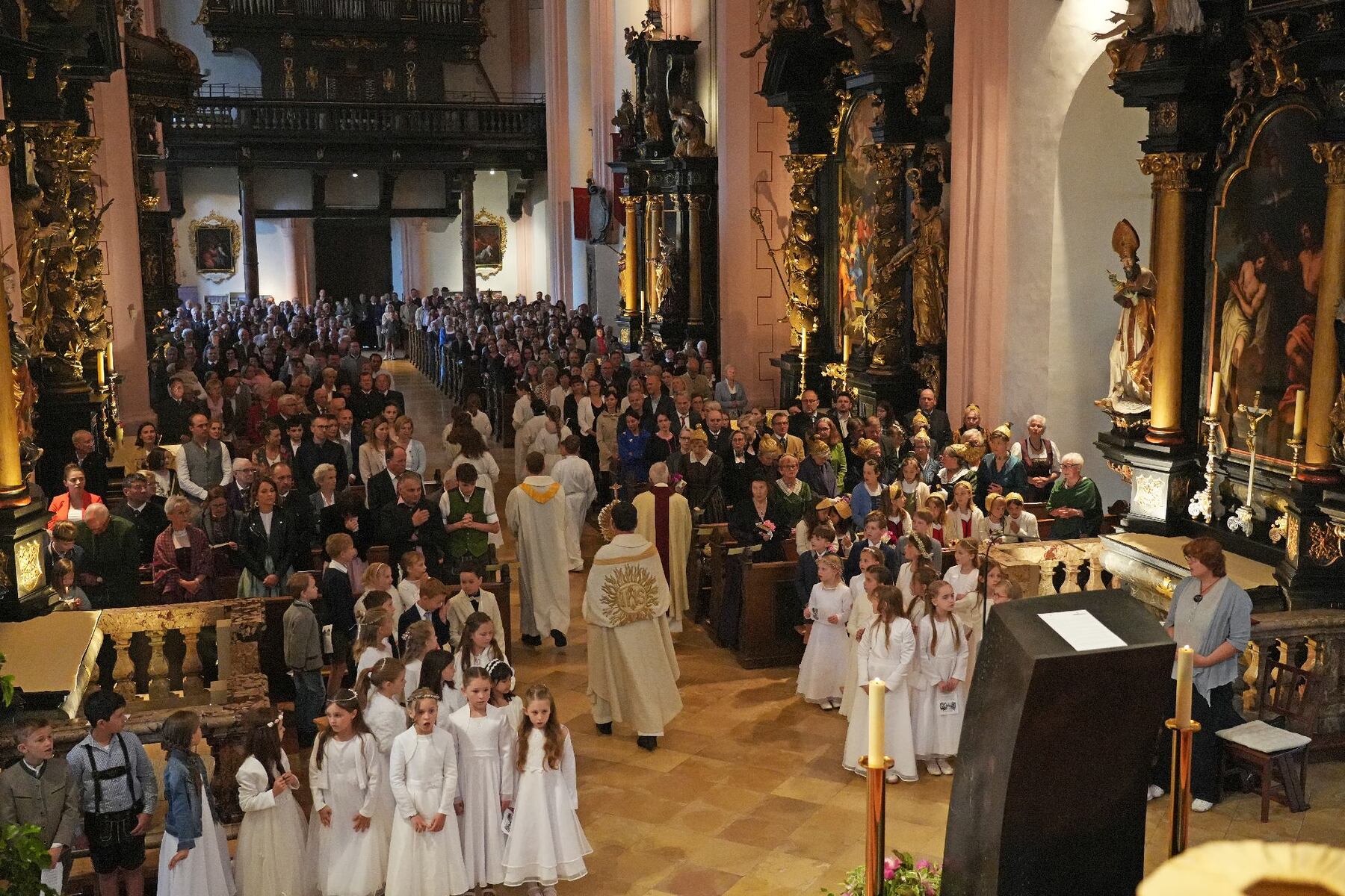 Pfarrer Reinhard Bell begrüßte die Bürgermeister des Mondseelandes, die Vertreter der Vereine und Zünfte und alle Gottesdienstbesucher ganz herzlich. Ganz besonders freute er sich über die vielen Erstkommunionkinder, die in ihren festlichen Kleidern am Gottesdienst teilnahmen.