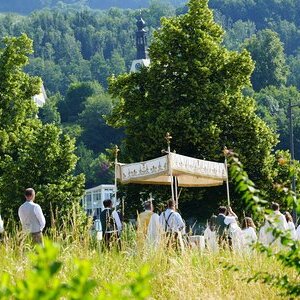 Bei der Prozession wird dann die Monstranz vom Priester unter dem Himmel getragen. Eine Monstranz ist ein kostbares, mit Gold gestaltetes liturgisches Schaugefäß mit einem Fensterbereich. In diesem wird eine konsekrierte Hostie, das Allerheiligste, zur Verehrung und Anbetung feierlich gezeigt. In unserer Pfarre wird die Monstranz zu Fronleichnam noch mit einem Kranz aus Blumen schön geschmückt.