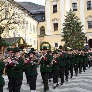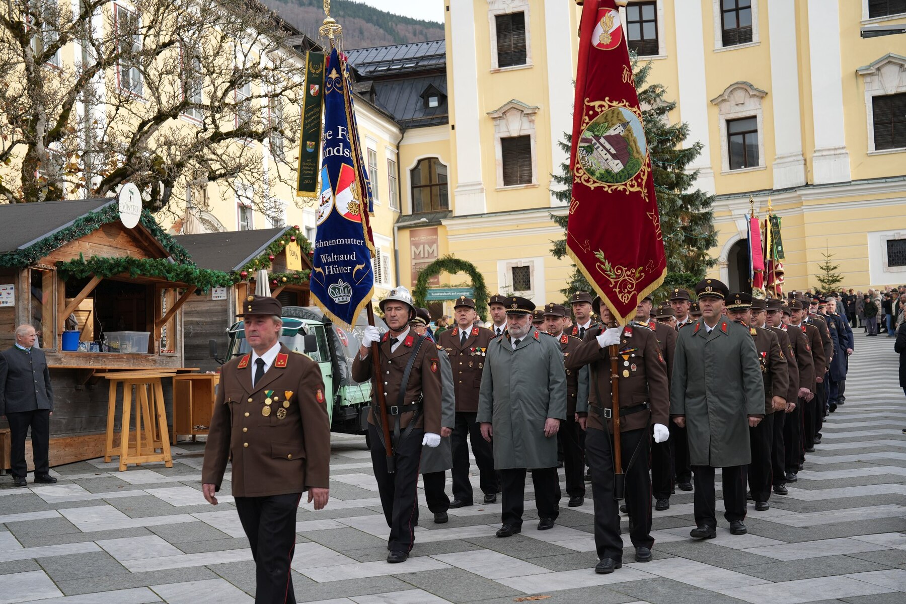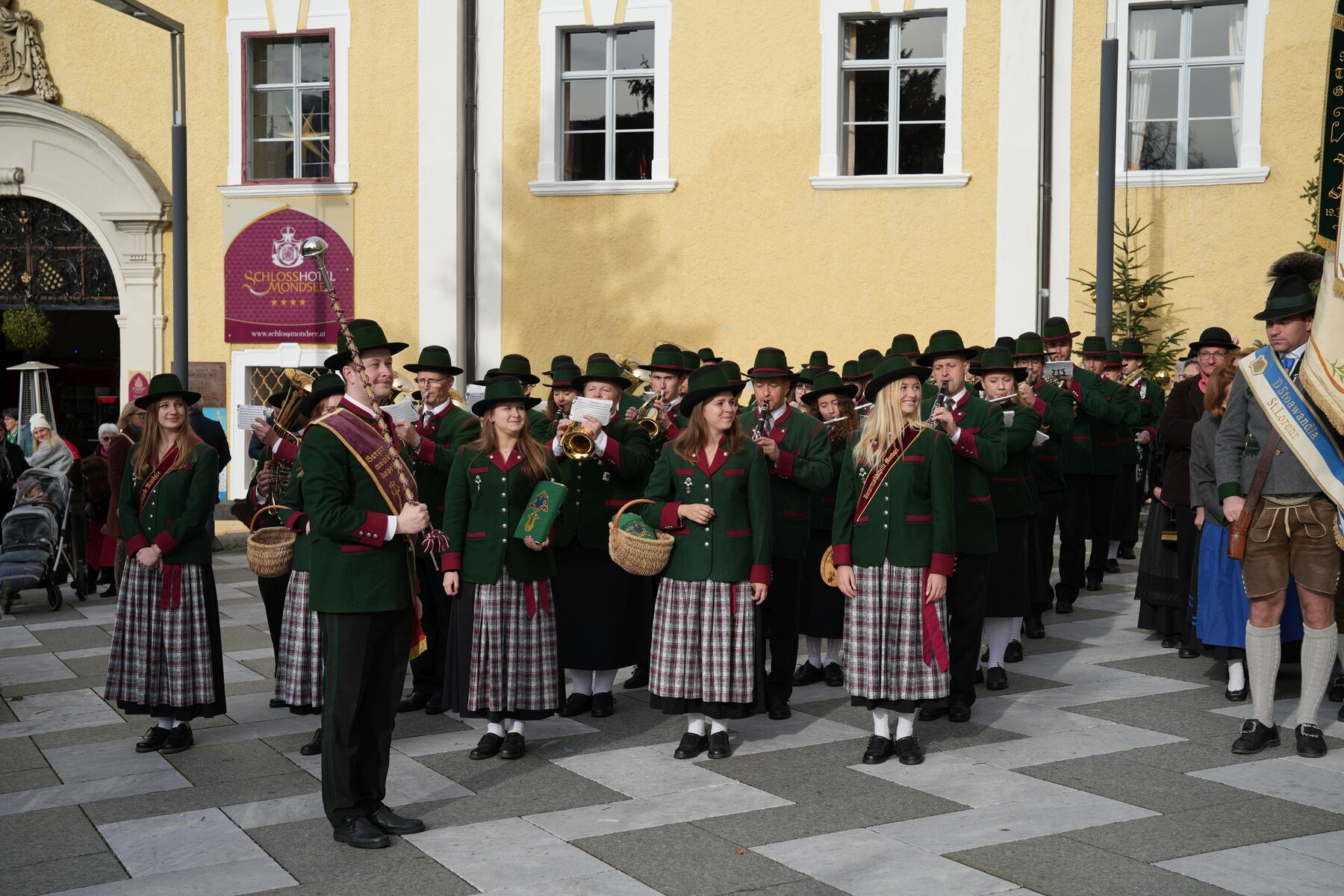Von den Prangerschützen Mondsee gab es einen Ehrensalut im Karlsgarten. Die Bürgermusikkapelle spielte am Kirchenplatz einige Märsche und führte dann den Festzug zur Säulenhalle im Schlosshotel Mondsee an.