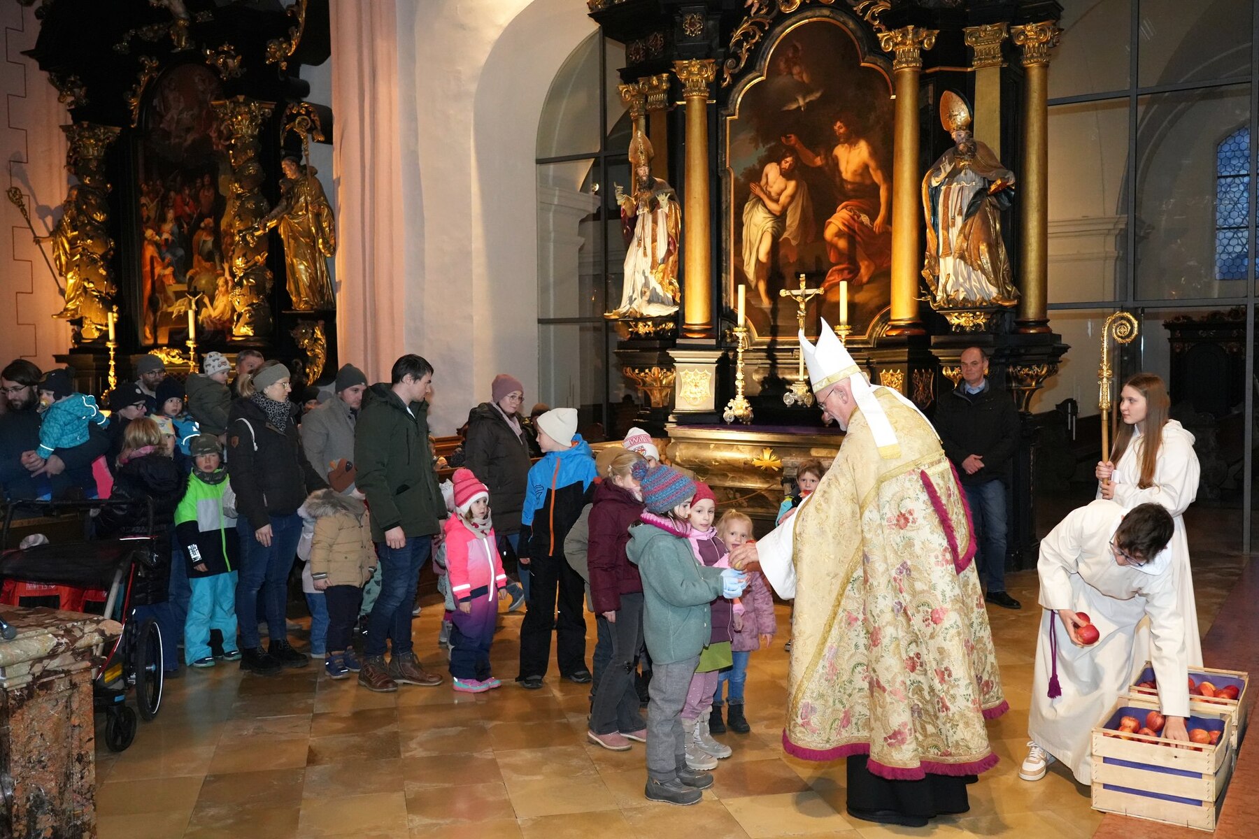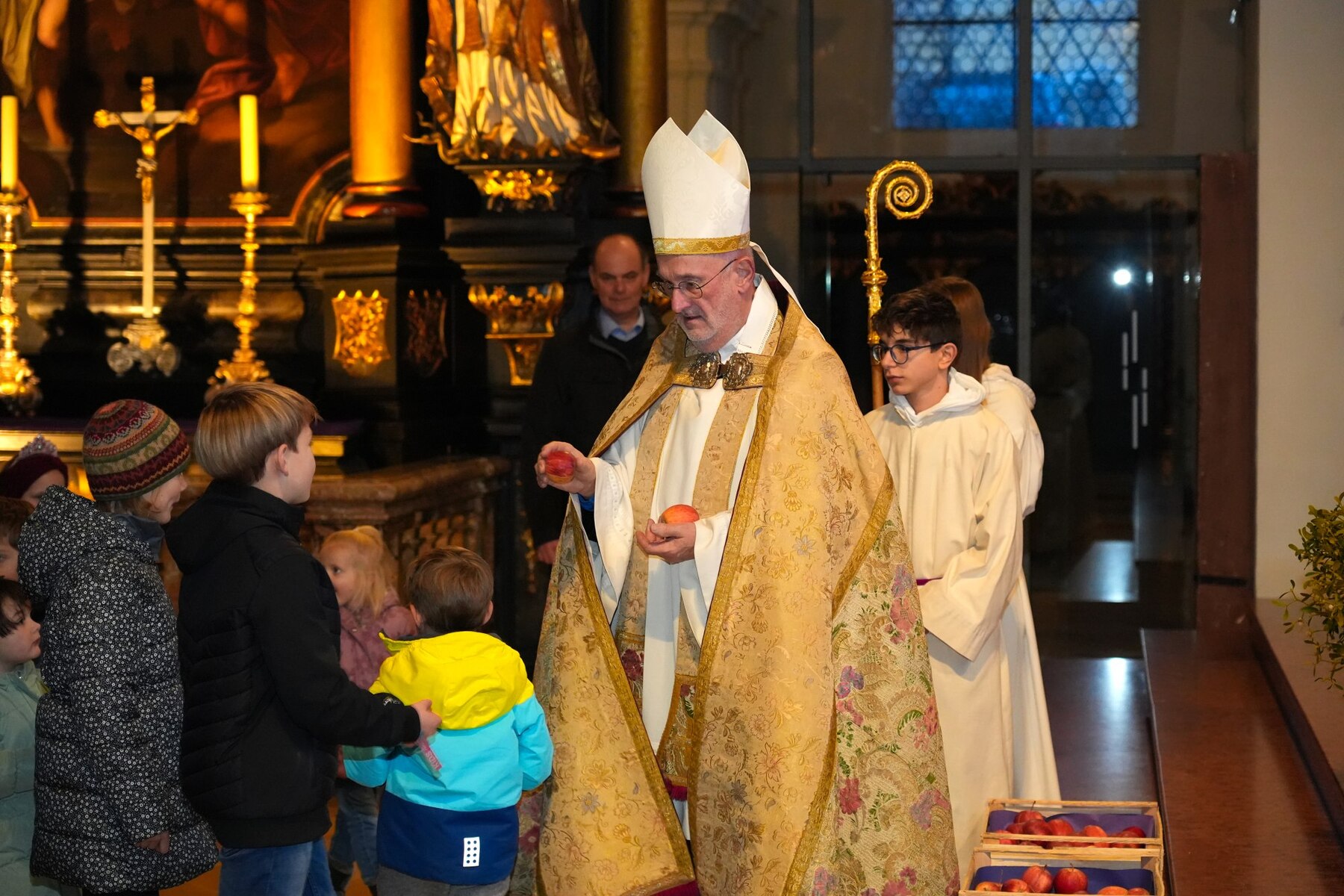 Am Ende der Feier teilte Bischof Nikolaus an alle Kinder rote Äpfel aus. Einige Kinder übergaben dem Nikolaus selbstgemalte Bilder als Geschenk, was ihn sehr freute.