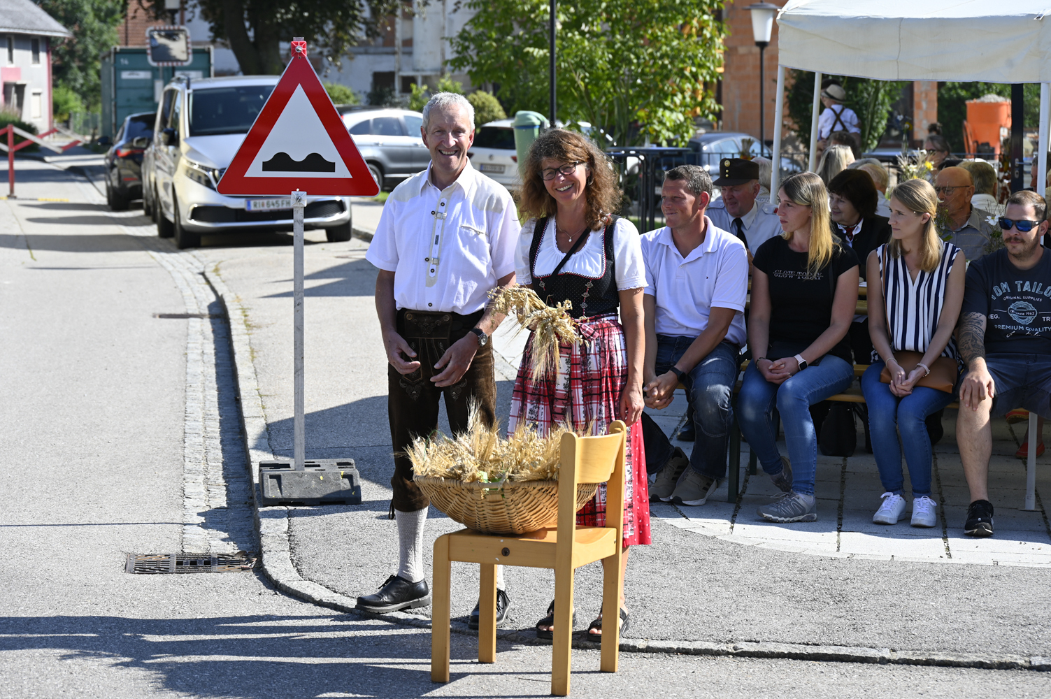 Dem Kindergarten, der mit einem schönen Wagerl von Gemüse und Obst gekommen ist, ein „gesunder Kindergarten“, der Goldhauben- und Kopftuchgruppe, der FF Mühlheim, der Musikkapelle unter Leitung von Fr. Viktoria Frauscher für die Messgestaltung, den Bäuerinnen für das Schmücken der Erntekrone, schließlich den PGRäten für die Gesamtorganisation. Es hatten alle genügend Bänke und Stühle zum Sitzen, die Sonne schien warm hernieder, wir bedachten: „Der Faden zieht sich durch“, der ökologische Faden, der geistige Faden.