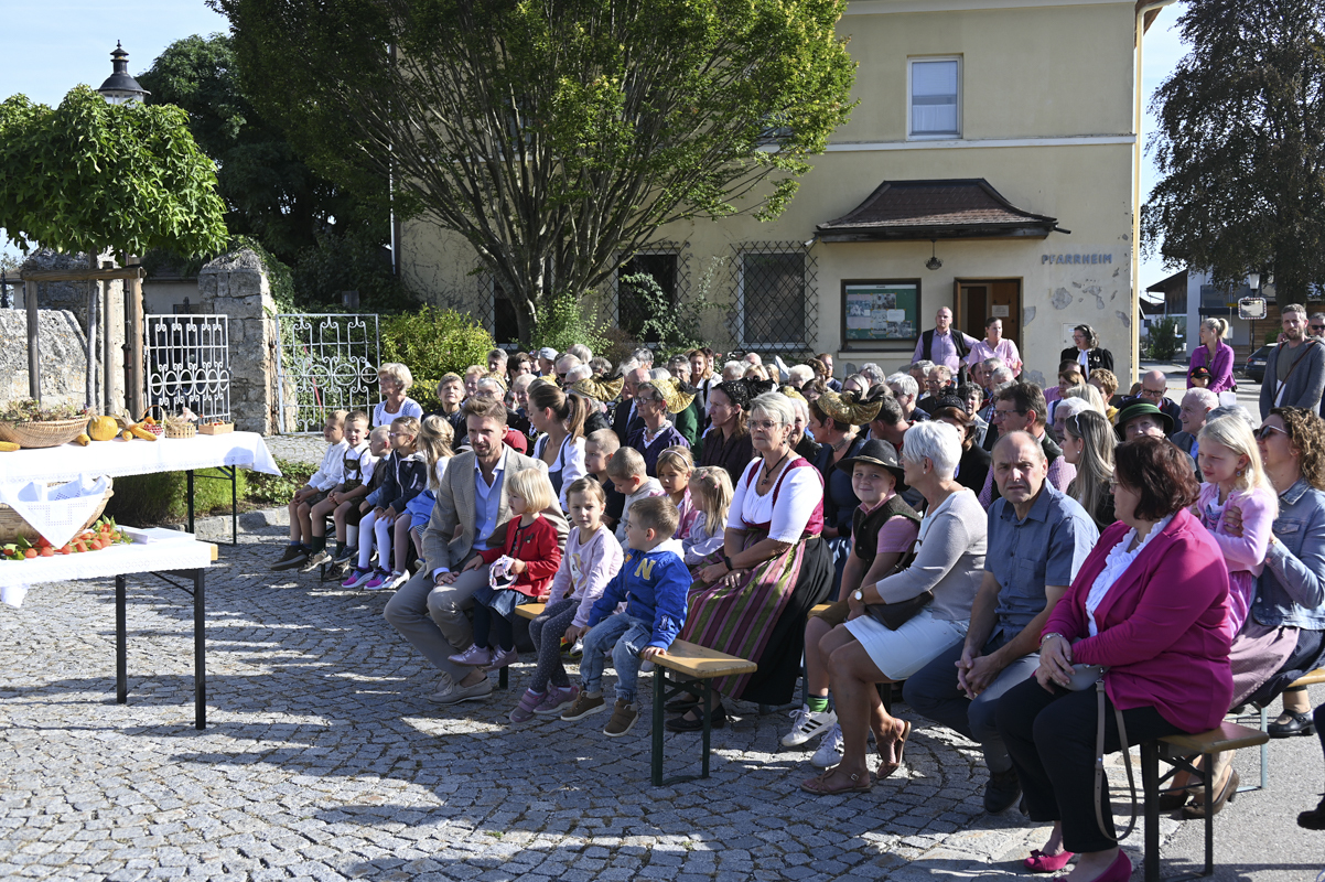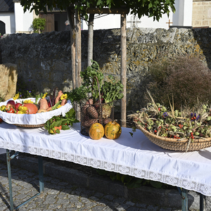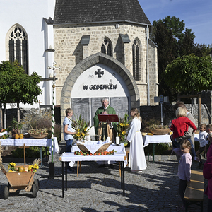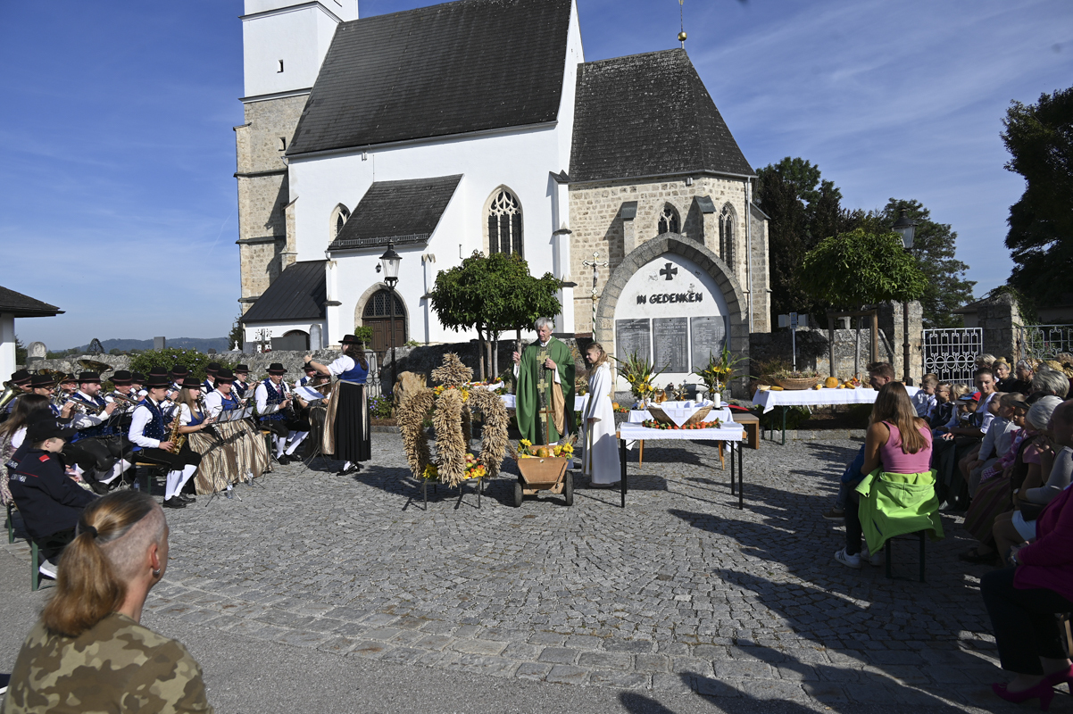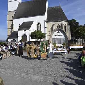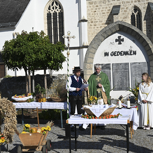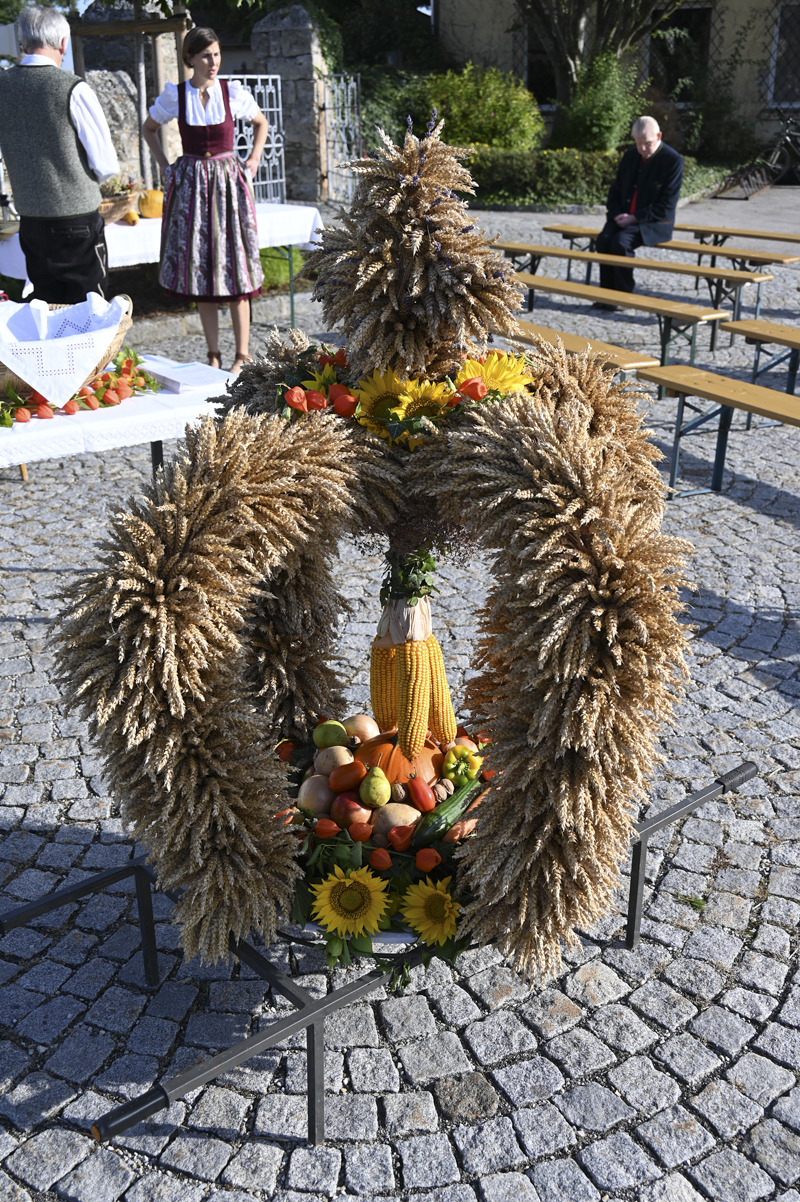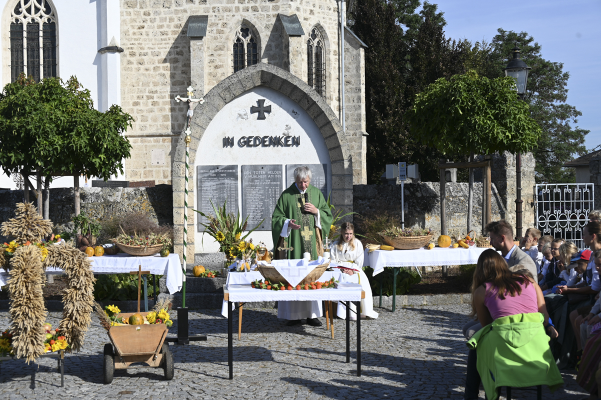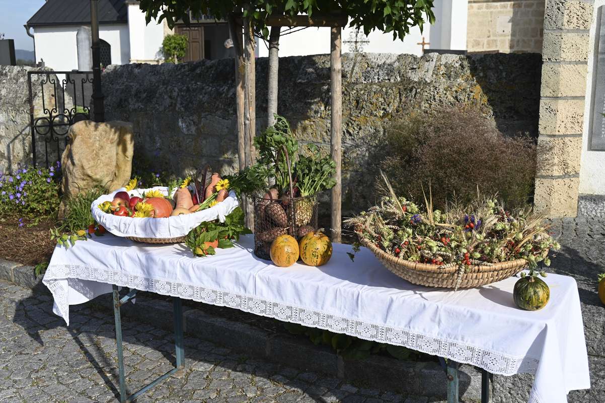 Danke den Bäuerinnen für die sehr schöne Erntekrone, dem Kindergarten für ihr Wagerl mit Früchten des Herbstes, dem Pfarrhofgarten für Korb, anderen Gärtnern für Obst und Früchte, danke für die schönen Erntebüscherl, generell für Blumenschmuck. Das war heuer ja das Thema: "Seht euch die Lilien des Feldes an" .