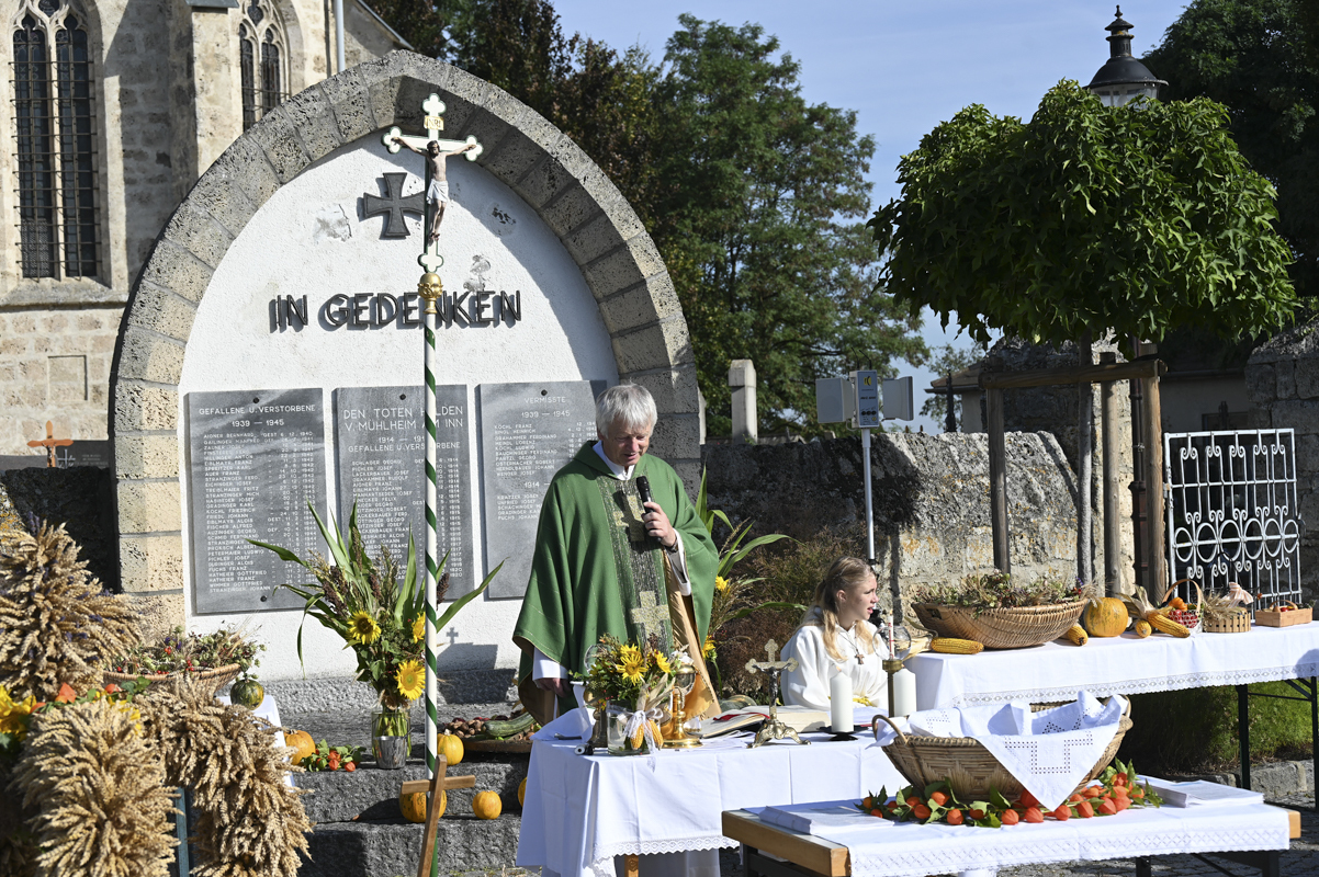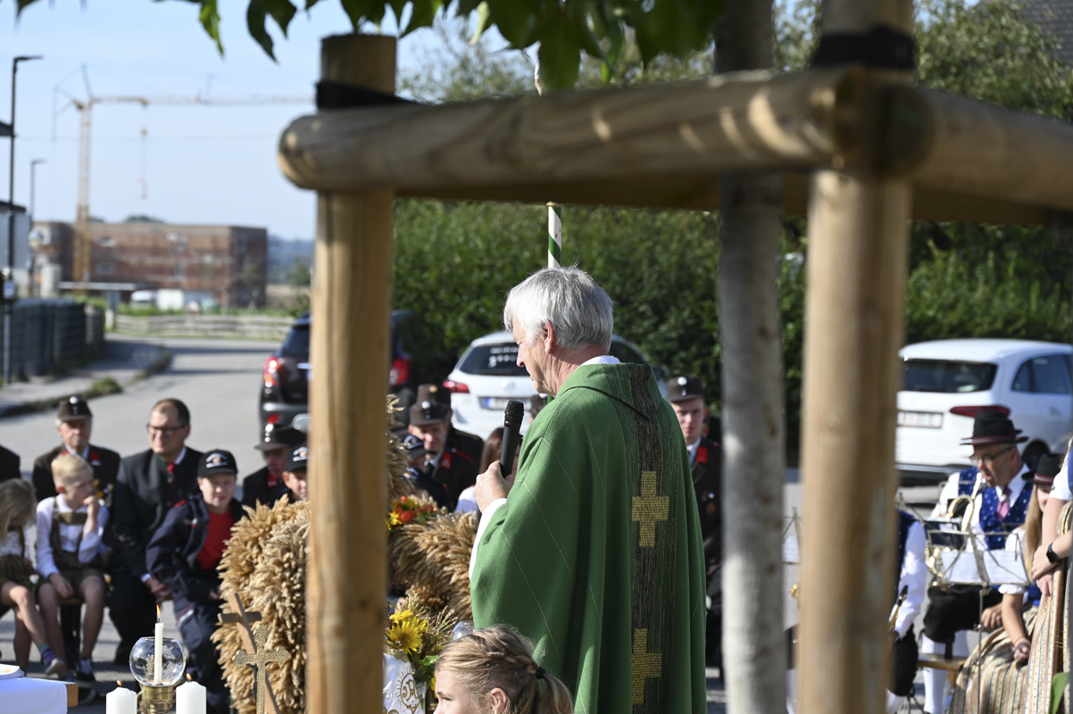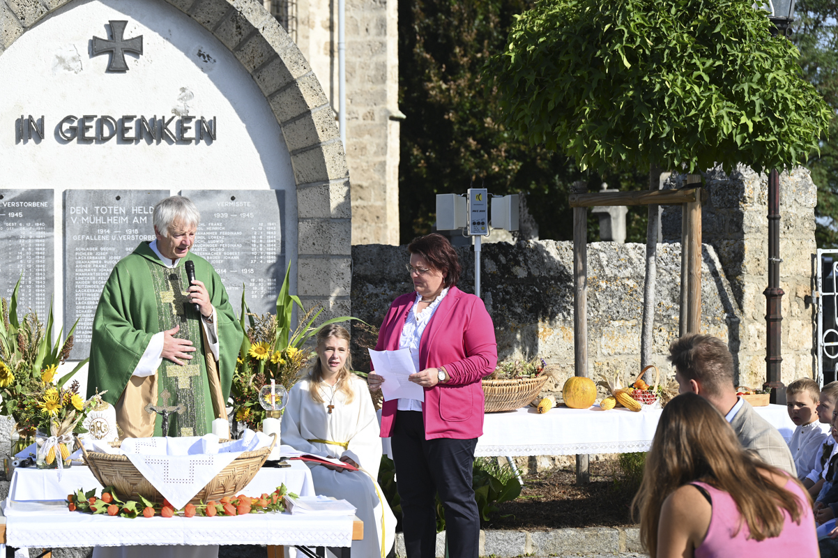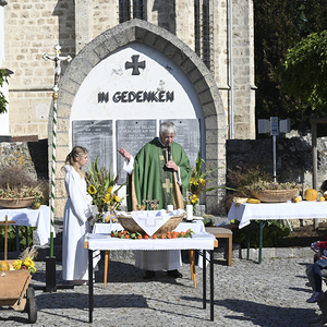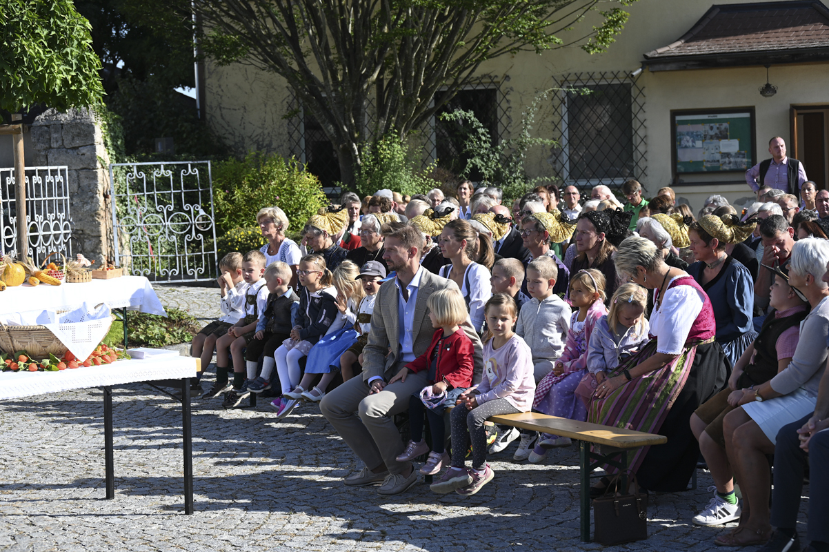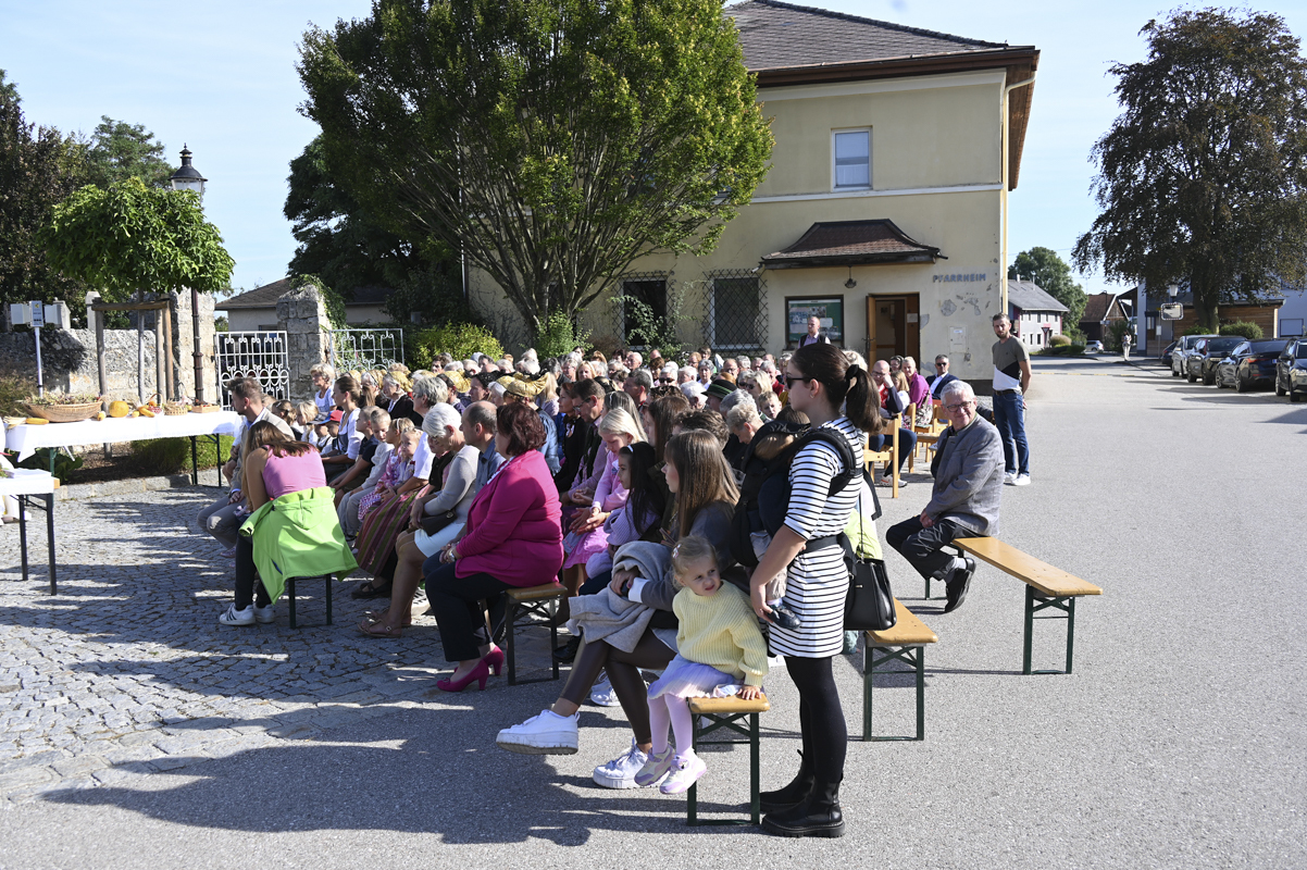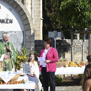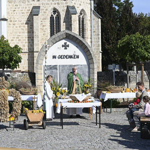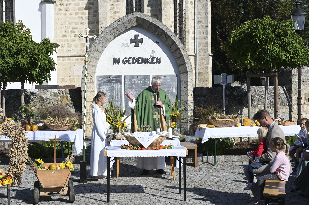 Danke den Bäuerinnen für die sehr schöne Erntekrone, dem Kindergarten für ihr Wagerl mit Früchten des Herbstes, dem Pfarrhofgarten für Korb, anderen Gärtnern für Obst und Früchte, danke für die schönen Erntebüscherl, generell für Blumenschmuck. Das war heuer ja das Thema: "Seht euch die Lilien des Feldes an" .
