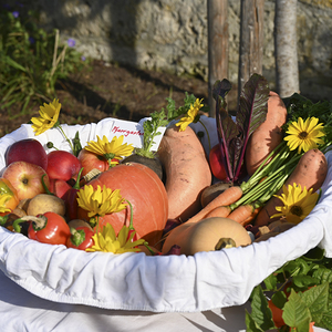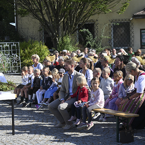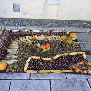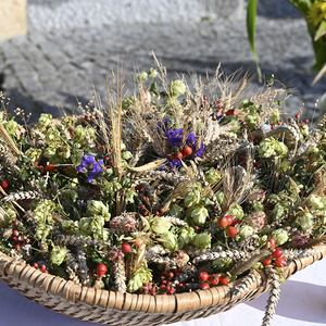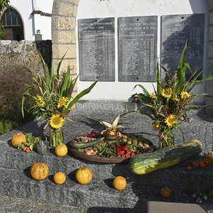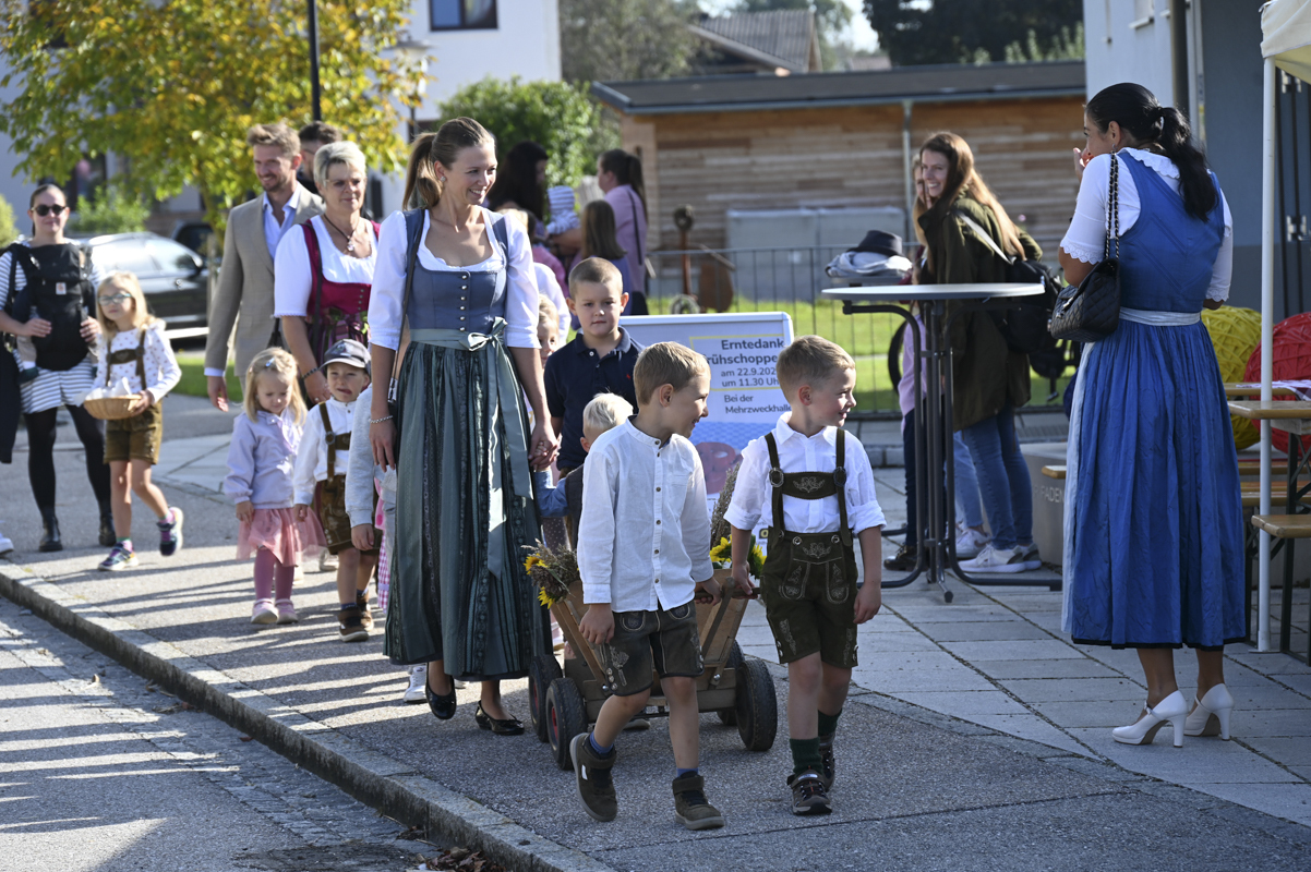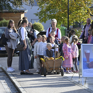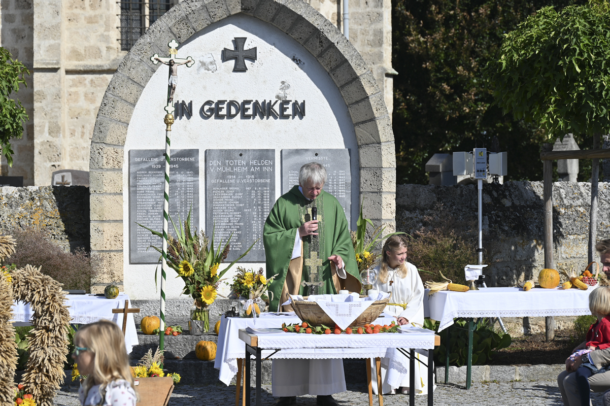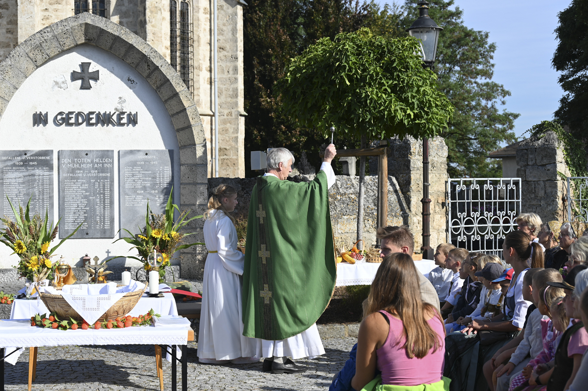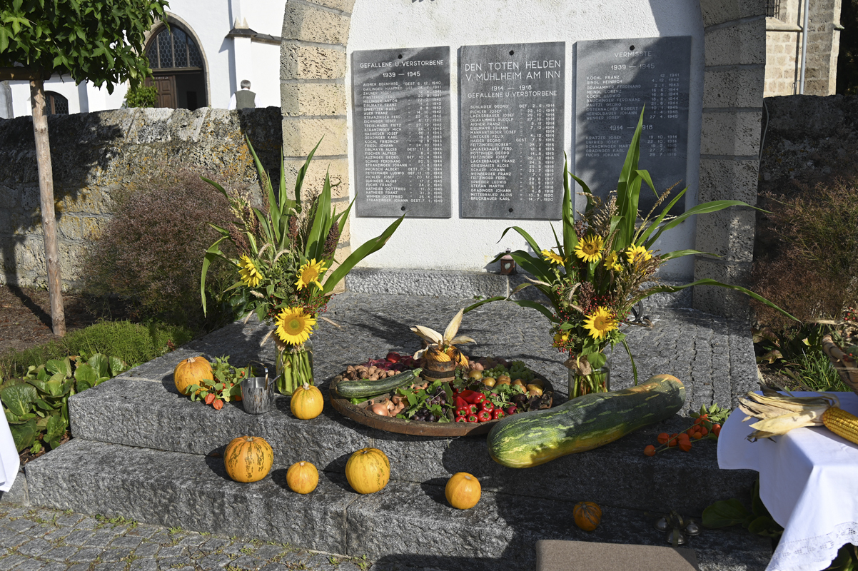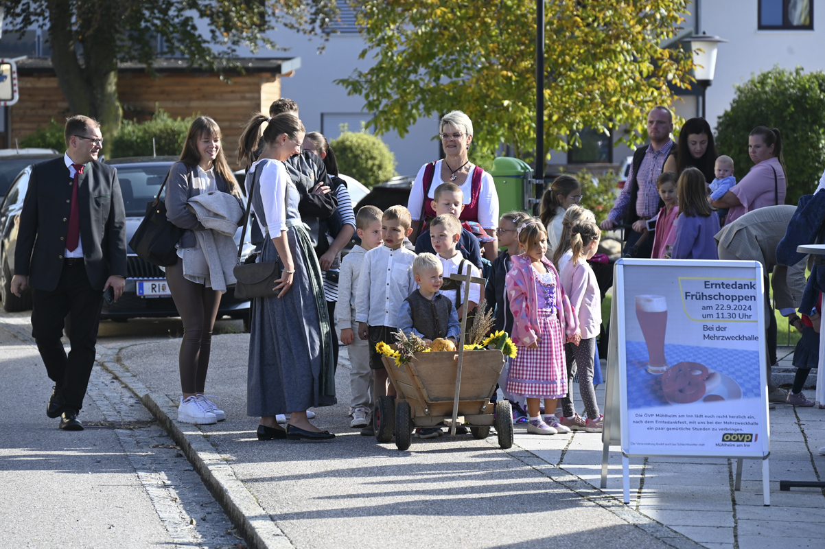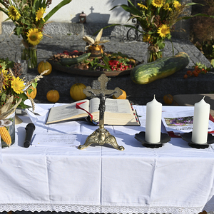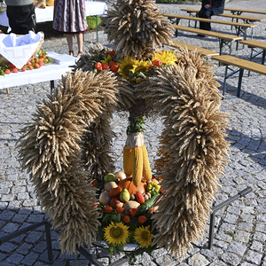 Danke den Bäuerinnen für die sehr schöne Erntekrone, dem Kindergarten für ihr Wagerl mit Früchten des Herbstes, dem Pfarrhofgarten für Korb, anderen Gärtnern für Obst und Früchte, danke für die schönen Erntebüscherl, generell für Blumenschmuck. Das war heuer ja das Thema: "Seht euch die Lilien des Feldes an" .