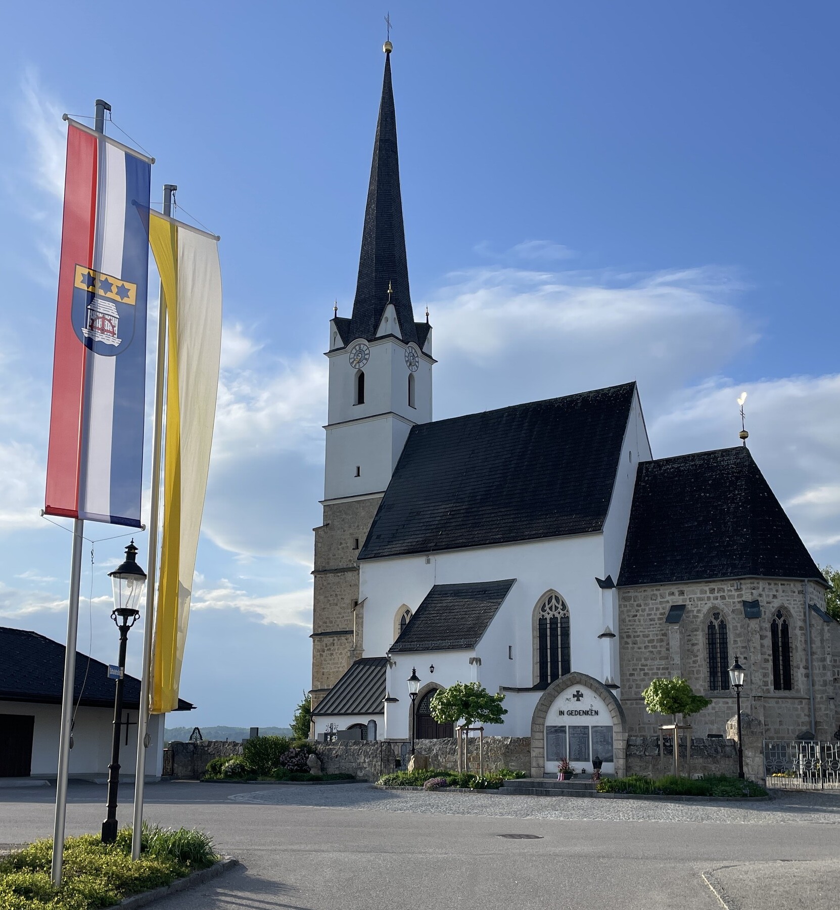 Anschließend legte die Gemeinde mit Hr. Bürgermeister Josef Berger Blumen nieder beim Kriegerdenkmal. Wir erinnerten an 80 Jahre Kriegsende, 70 Jahre Staatsvertrag, 30 Jahre EU-Mitgliedschaft.
