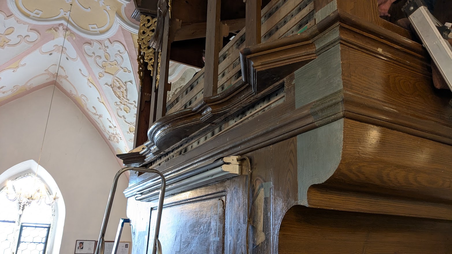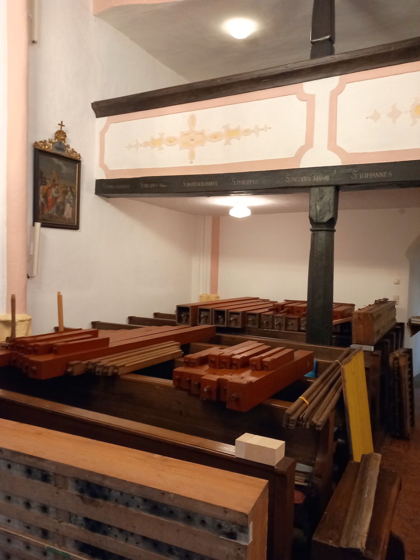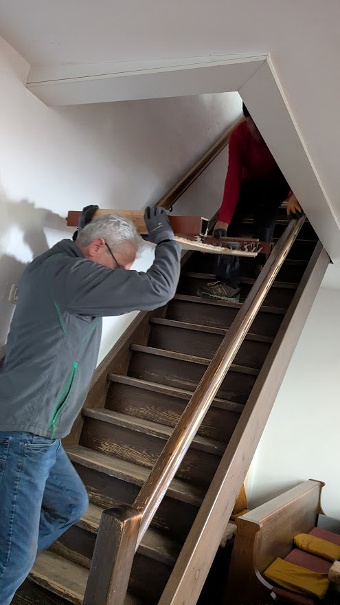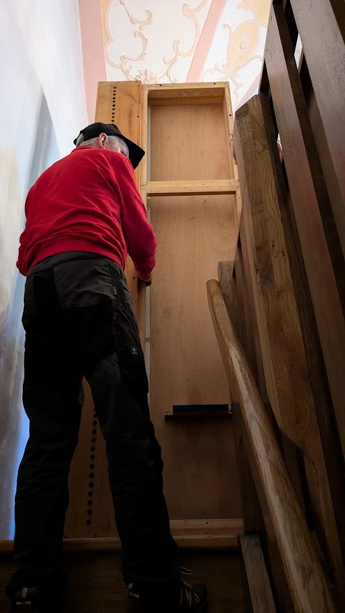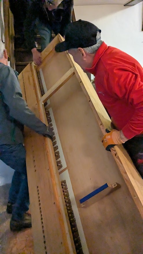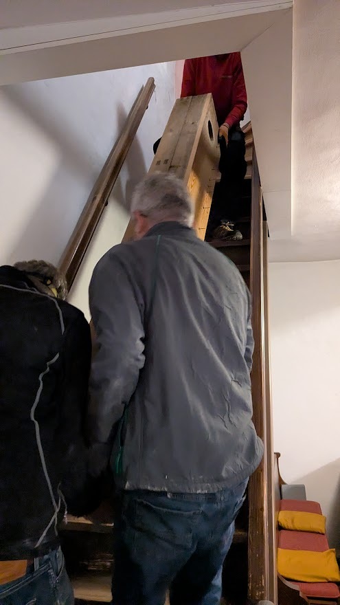 Es wurden die Windladen (große hölzerne Kästen, in den die Luft auf die verschiedenen Pfeifen verteilt wird) ausgebaut. Der Abtransport über die gewendelte Stiege war Millimeter-Arbeit. Beim Wiedereinbau wird ein Aufzug zwingend erforderlich sein.