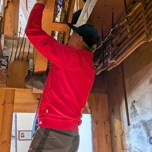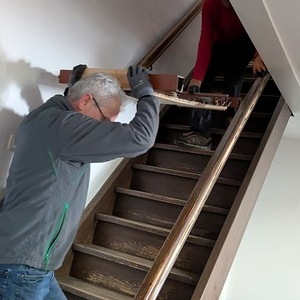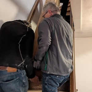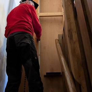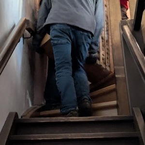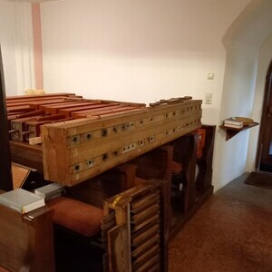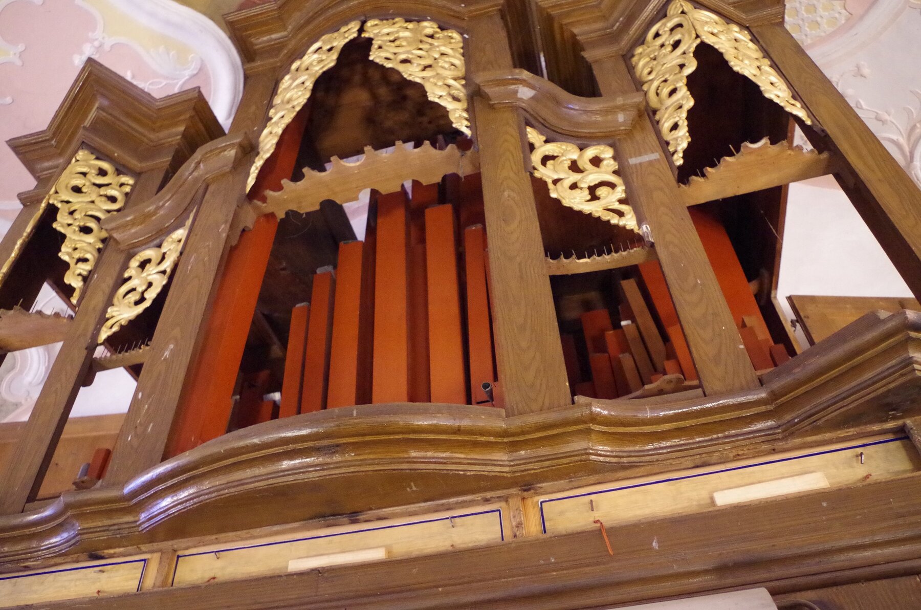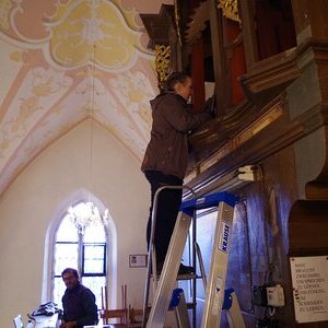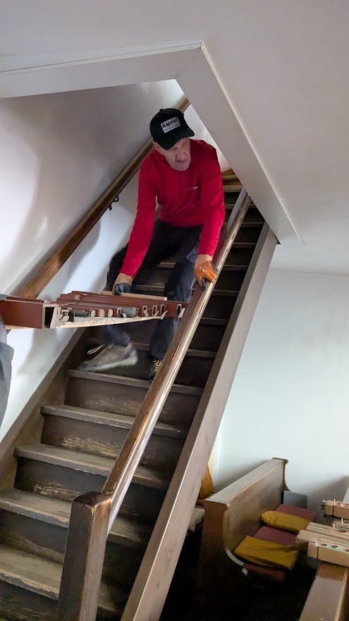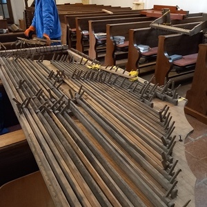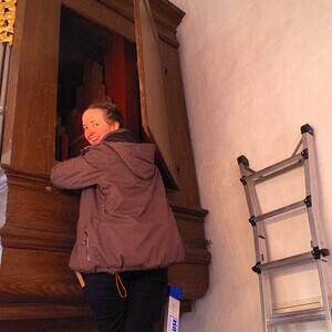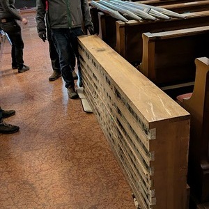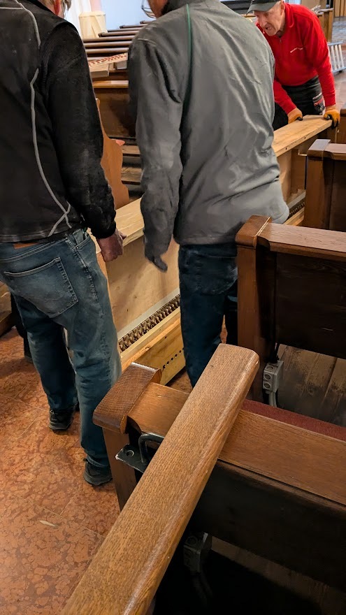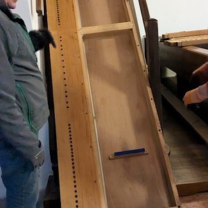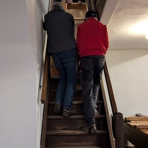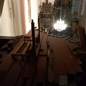Es wurden die Windladen (große hölzerne Kästen, in den die Luft auf die verschiedenen Pfeifen verteilt wird) ausgebaut. Der Abtransport über die gewendelte Stiege war Millimeter-Arbeit. Beim Wiedereinbau wird ein Aufzug zwingend erforderlich sein.