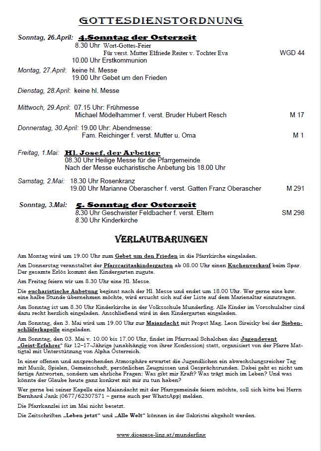 Gebet für den Frieden in der Pfarrkirche Munderfing Jeden Montag wird um 19.00 Uhr zum Gebet um den Frieden in der Welt in die Kirche eingeladen. Am Montag, 4. Mai und am Pfingstmontag, 25. Mai 2026 entfällt das Friedensgebet.