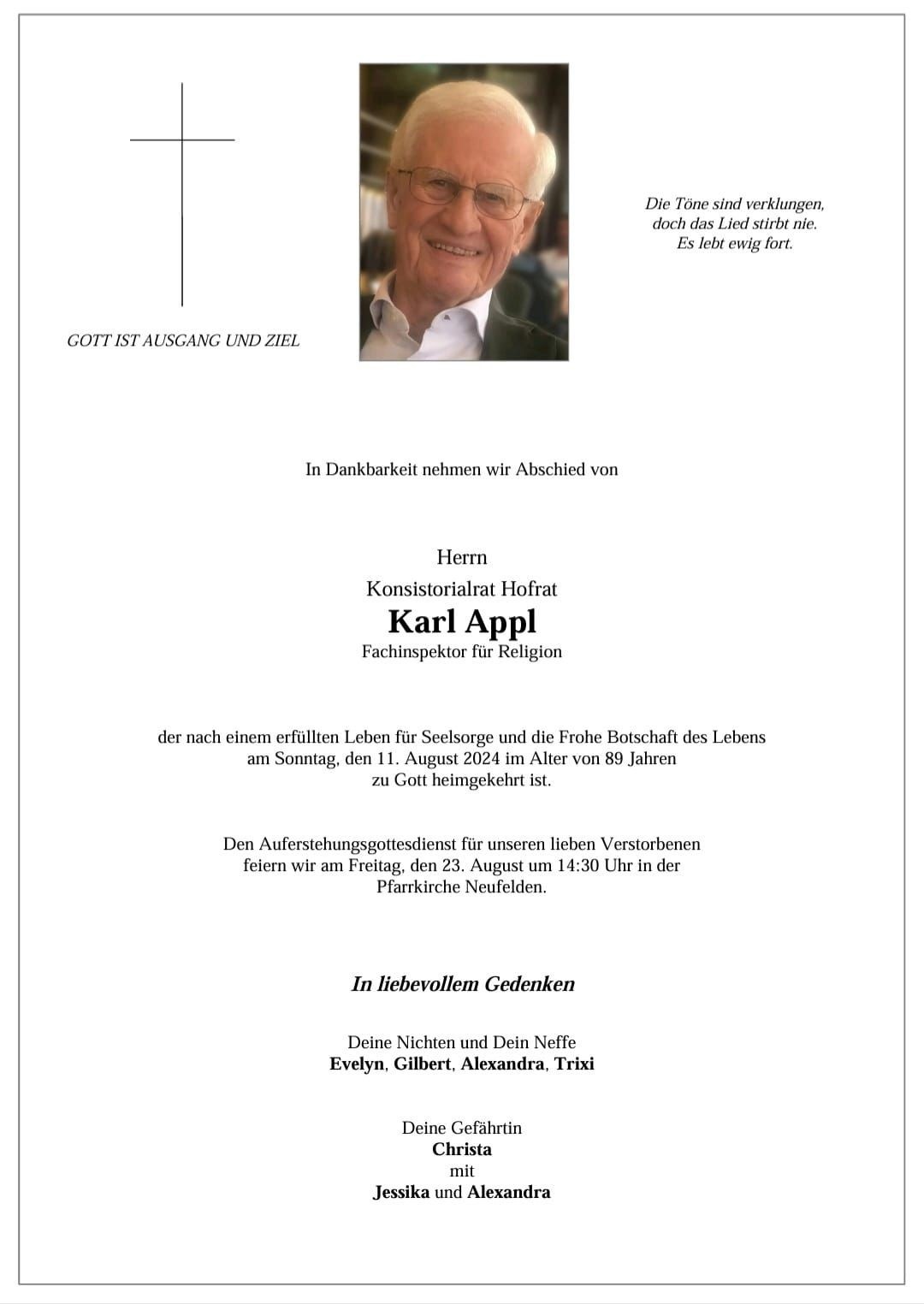 Hofrat Konsistorialrat Karl Appl (*1935 / + 11.08. 2024 Vöcklabruck), Download Parte Karl Appl