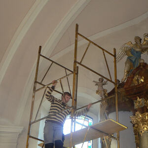 Durch Gerüstbau oder Dacheindeckung kamen im Jahr 2010 zu den bisherigen Langzeitschäden (gesprungene Gläser, löchrige Bleiverglasungen) noch Löcher, bzw. eingeschlagene Putzenscheiben hinzu. So wurde also eine Generalüberholung durch die Fa. Glasindustrie Schlierbach notwendig.