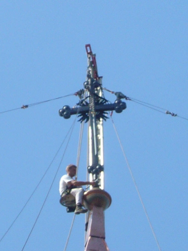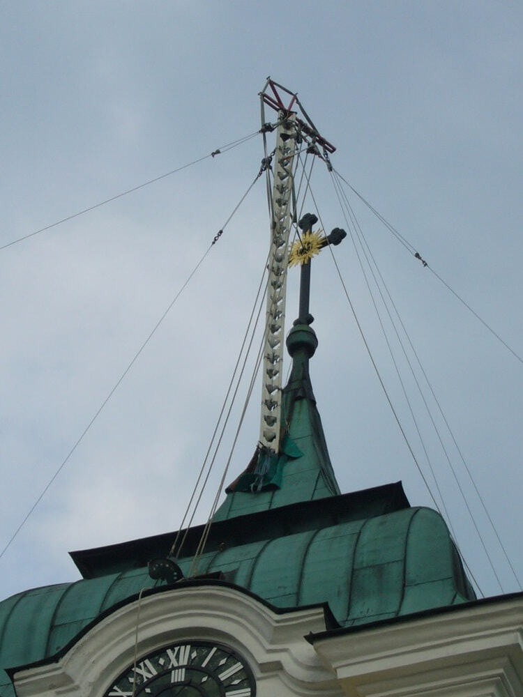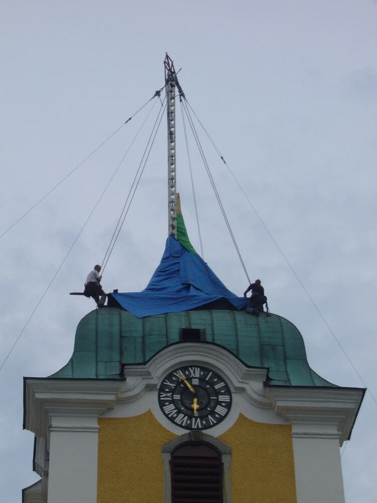 Aufgrund der Vermorschung und der Beschädigungen des zentralen Helmbaumes und des Balkens der oberen Hälfte des Turmdaches, war bereits eine erhebliche Schiefstellung des Turmkreuzes zu sehen, sodass fast die gesamte obere Turmhelmhälfte zu erneuern war.