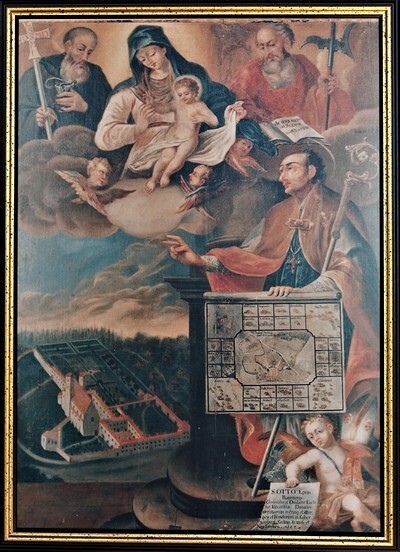 Der untere Bildteil zeigt links das Kloster Asbach in seinem imposanten Ausmaß und rechts eine Textrolle in der Hand eines Putto mit der lateinischen Aufschrift: