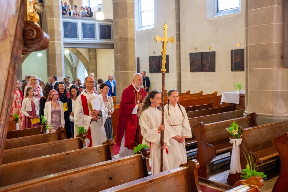 Domprobst Msgr. Willi Vieböck spendete den Firmlingen am 7. Juni 2025 in der Pfarrkirche das Sakrament der Firmung. Musikalisch gestaltet wurde die Feier von chor&more.