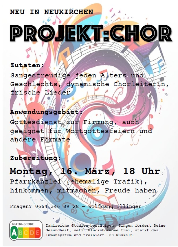 „Wer singt, betet doppelt.“, besagt ein geflügeltes Wort. Für den Firmgottesdienst am Pfingstmontag starten wir heuer einen Projekt:Chor. Wer Freude am Singen hat, ist herzlich zum Auftakt am Montag, 16. März, um 18 Uhr in die Pfarrkanzlei eingeladen. Unter Leitung von Malina Maurer wollen wir in den nächsten Wochen miteinander ein paar Lieder einstudieren.
