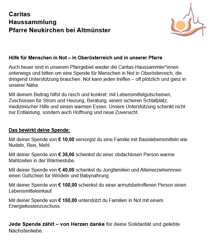 Im Dienst der guten Sache unterwegs sein, mit dem Herzen sehen und helfen. Unter diesem Aspekt sind unsere Haussammler*innen wieder von Haus zu Haus in Neukirchen unterwegs. Wir bitten um freundliche Aufnahme.