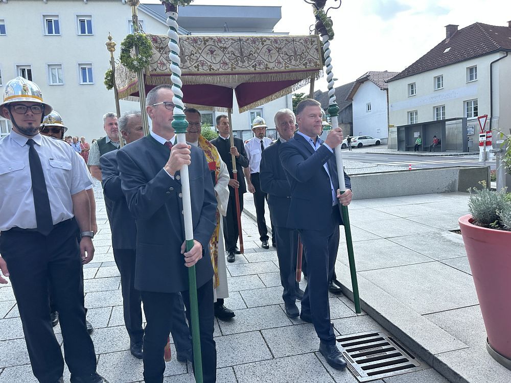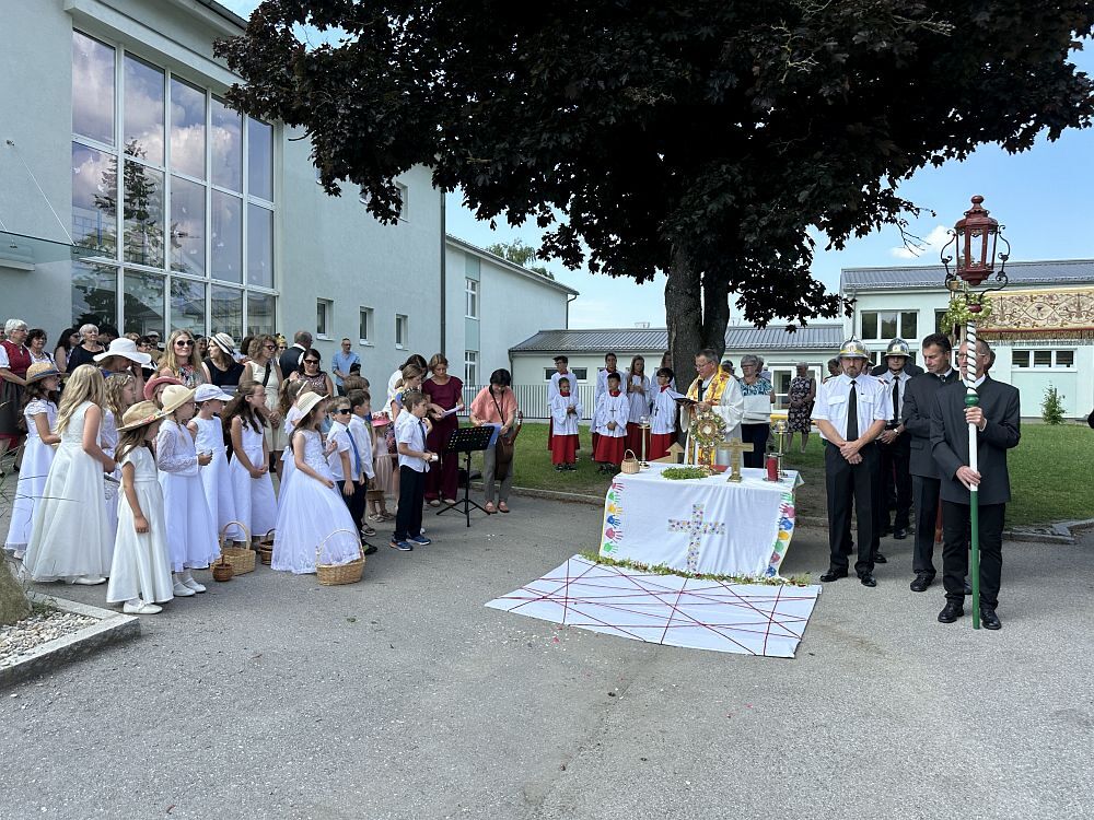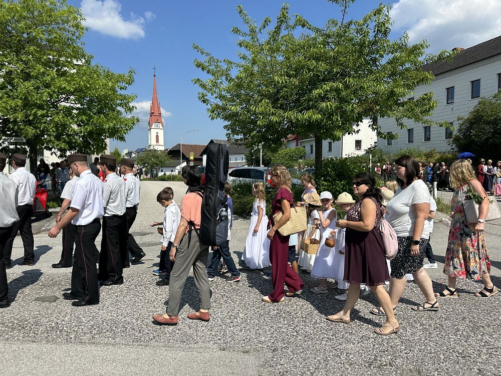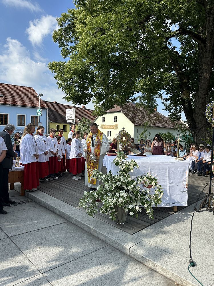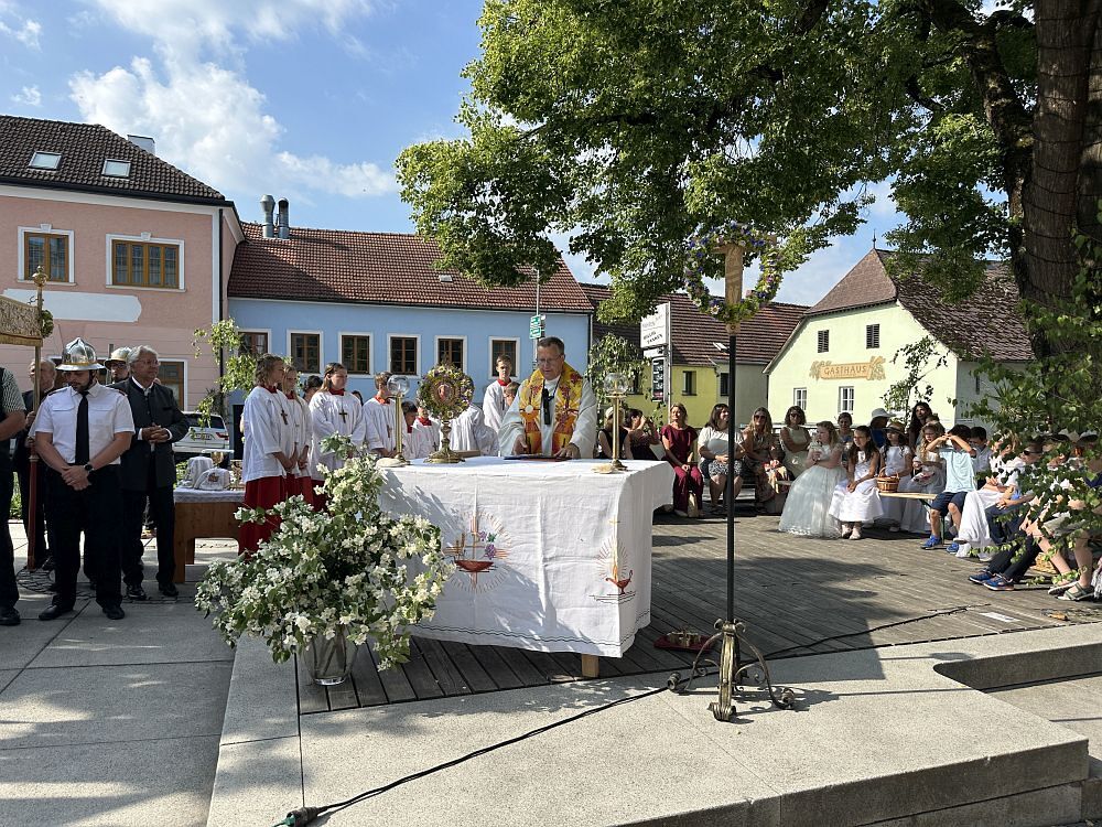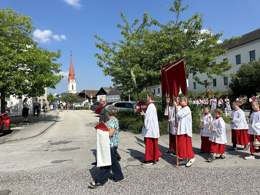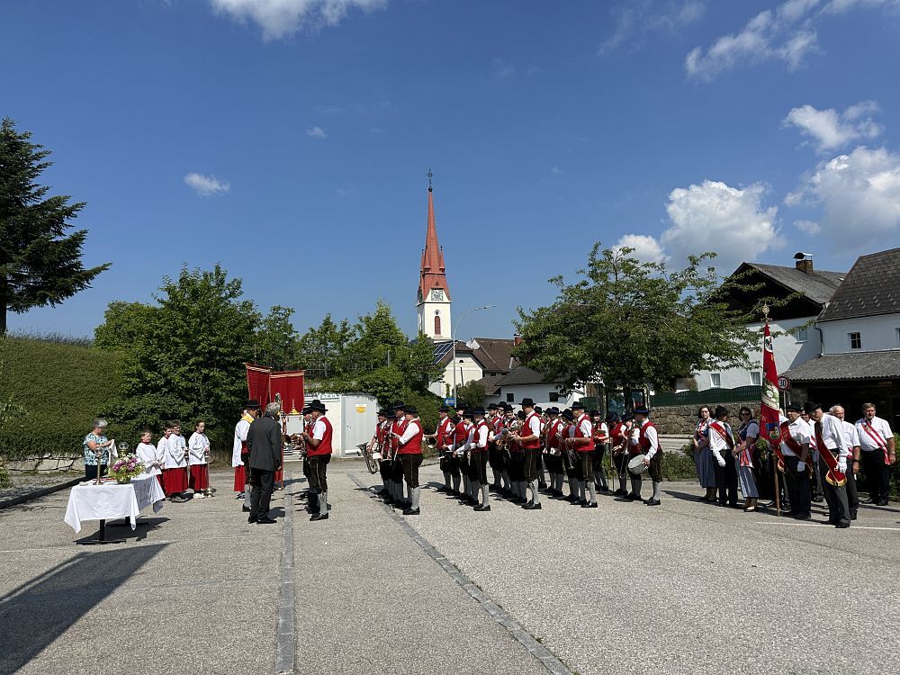 Bei strahlendem Sonnenschein feierten wir Fronleichnam 2025 mit einem festlichen Gottesdienst auf der Bretterbühne im Freien. Im Anschluss zogen wir in einer Prozession zur Raiffeisenbank, weiter zur Volksschule und schließlich zur Pfarrkirche, wo die Feier ihren feierlichen Abschluss fand.