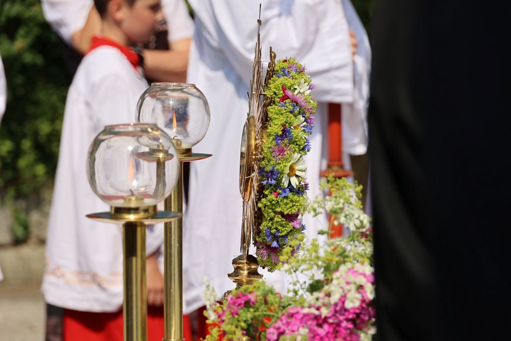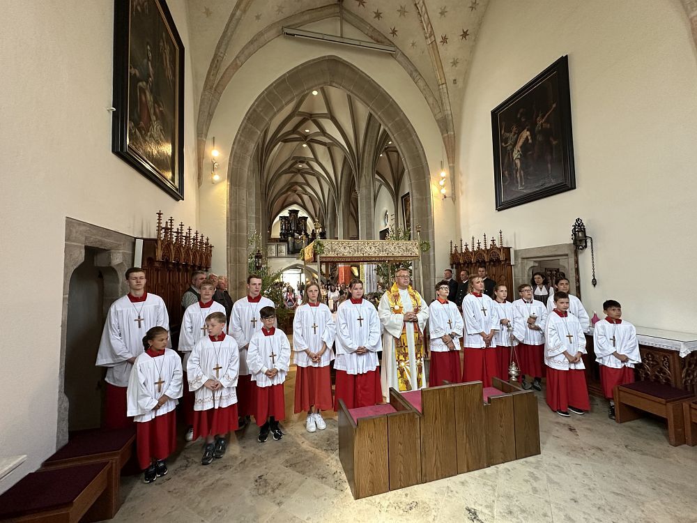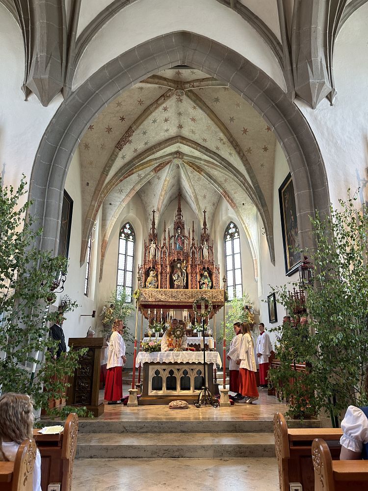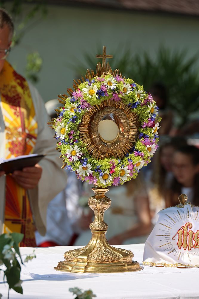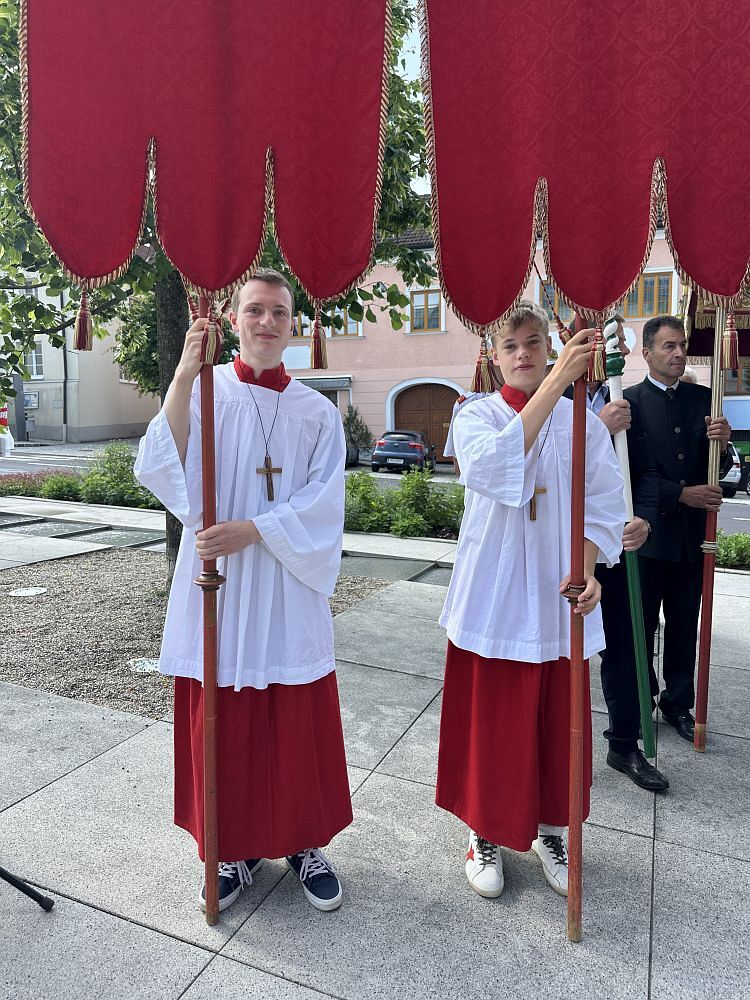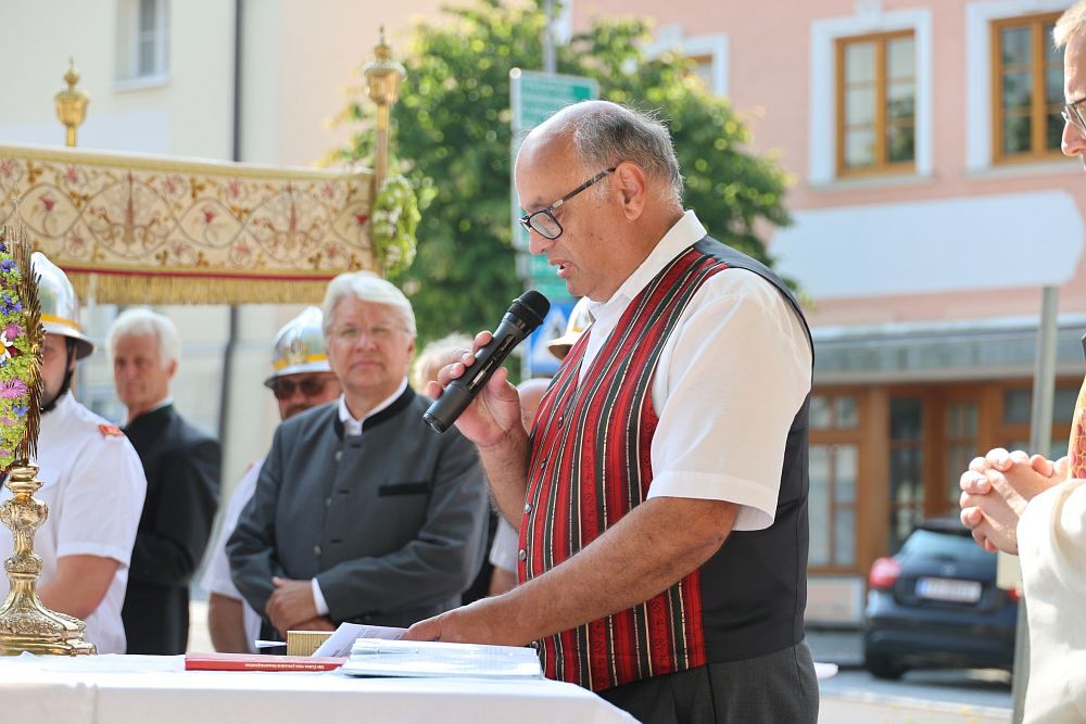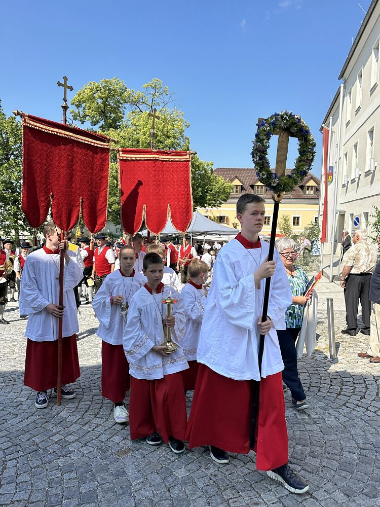 Bei strahlendem Sonnenschein feierten wir Fronleichnam 2025 mit einem festlichen Gottesdienst auf der Bretterbühne im Freien. Im Anschluss zogen wir in einer Prozession zur Raiffeisenbank, weiter zur Volksschule und schließlich zur Pfarrkirche, wo die Feier ihren feierlichen Abschluss fand.
