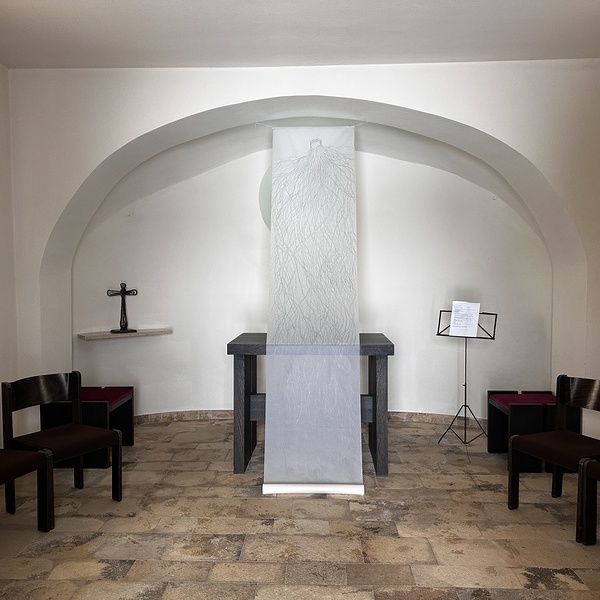 Das von Christine Böhm gestaltete Fastentuch gab der Andacht eine eindrucksvolle und besinnliche Atmosphäre.
