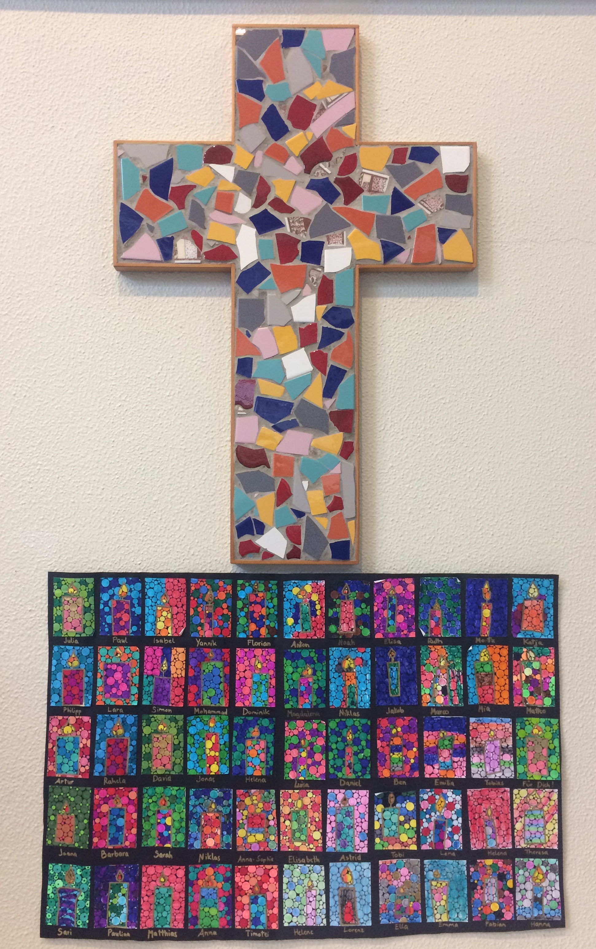 Passend dazu hat jedes Kind eine Kerze gestaltet und aus den vielen kleinen Kunstwerken ist ein Großes entstanden. Bis 5. Jänner war es - mit unserem Weihnachtswunsch an Sie alle - in der Kirche angebracht, nun hat es seinen Platz in der Schulaula unterm Kreuz gefunden.